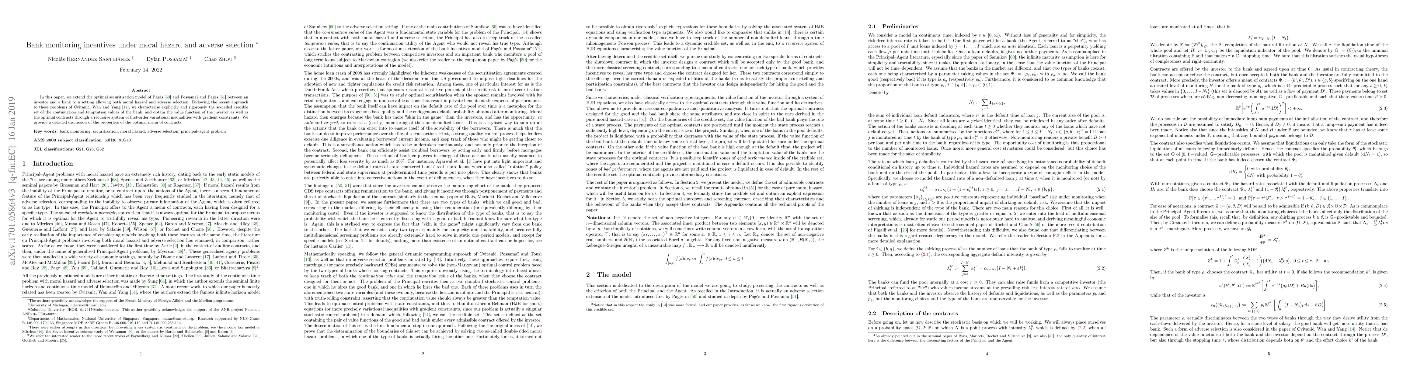 This paper extends the optimal securitisation model to include moral hazard and adverse selection, deriving the investor's value function and optimal contracts through a recursive system of first-order variational inequalities. It explores the properties of the optimal menu of contracts in the presence of these market imperfections.