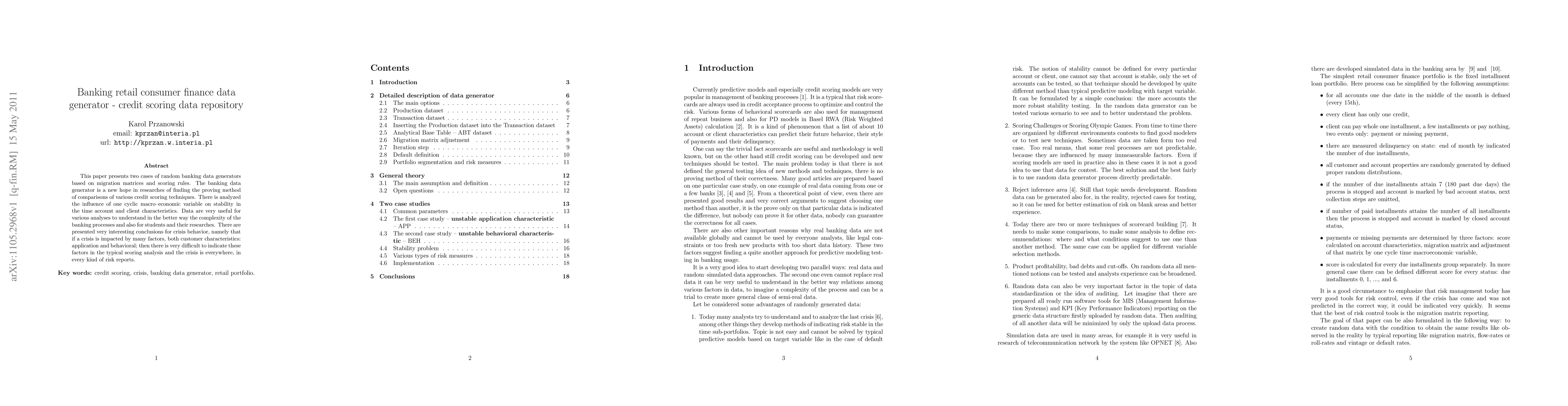 This paper presents two cases of random banking data generators based on migration matrices and scoring rules. The banking data generator is a new hope in researches of finding the proving method of comparisons of various credit scoring techniques. There is analyzed the influence of one cyclic macro--economic variable on stability in the time account and client characteristics. Data are very useful for various analyses to understand in the better way the complexity of the banking processes and also for students and their researches. There are presented very interesting conclusions for crisis behavior, namely that if a crisis is impacted by many factors, both customer characteristics: application and behavioral; then there is very difficult to indicate these factors in the typical scoring analysis and the crisis is everywhere, in every kind of risk reports.