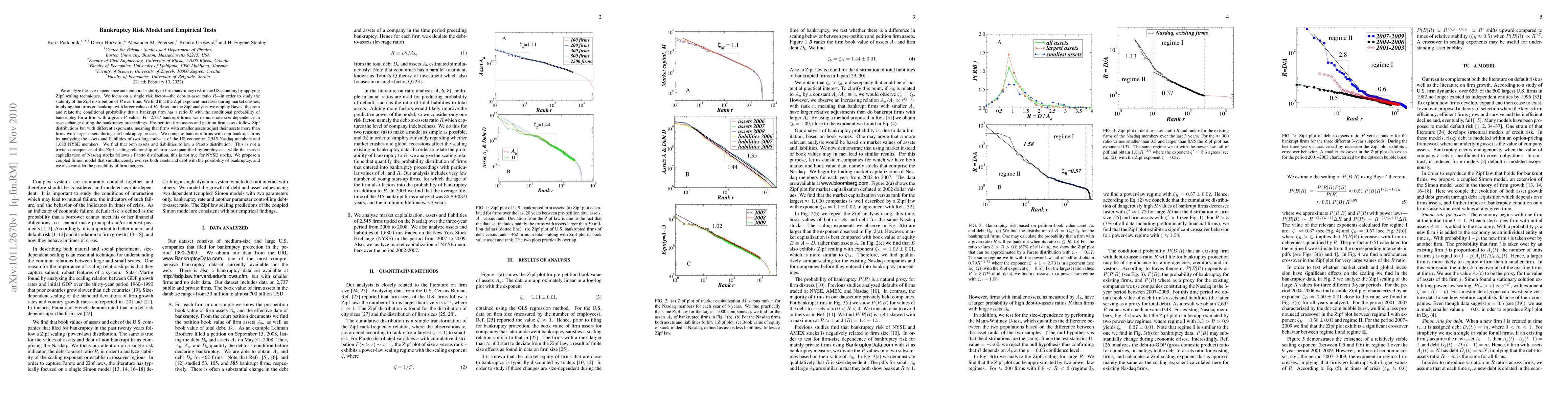 We analyze the size dependence and temporal stability of firm bankruptcy risk in the US economy by applying Zipf scaling techniques. We focus on a single risk factor-the debt-to-asset ratio R-in order to study the stability of the Zipf distribution of R over time. We find that the Zipf exponent increases during market crashes, implying that firms go bankrupt with larger values of R. Based on the Zipf analysis, we employ Bayes's theorem and relate the conditional probability that a bankrupt firm has a ratio R with the conditional probability of bankruptcy for a firm with a given R value. For 2,737 bankrupt firms, we demonstrate size dependence in assets change during the bankruptcy proceedings. Prepetition firm assets and petition firm assets follow Zipf distributions but with different exponents, meaning that firms with smaller assets adjust their assets more than firms with larger assets during the bankruptcy process. We compare bankrupt firms with nonbankrupt firms by analyzing the assets and liabilities of two large subsets of the US economy: 2,545 Nasdaq members and 1,680 New York Stock Exchange (NYSE) members. We find that both assets and liabilities follow a Pareto distribution. The finding is not a trivial consequence of the Zipf scaling relationship of firm size quantified by employees-although the market capitalization of Nasdaq stocks follows a Pareto distribution, the same distribution does not describe NYSE stocks. We propose a coupled Simon model that simultaneously evolves both assets and debt with the possibility of bankruptcy, and we also consider the possibility of firm mergers.