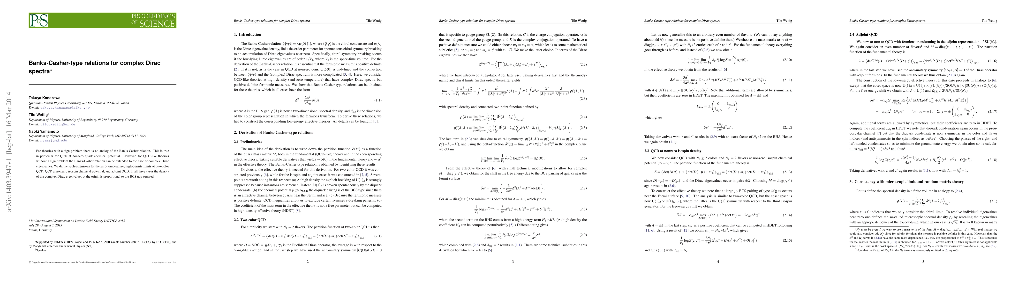 For theories with a sign problem there is no analog of the Banks-Casher relation. This is true in particular for QCD at nonzero quark chemical potential. However, for QCD-like theories without a sign problem the Banks-Casher relation can be extended to the case of complex Dirac eigenvalues. We derive such extensions for the zero-temperature, high-density limits of two-color QCD, QCD at nonzero isospin chemical potential, and adjoint QCD. In all three cases the density of the complex Dirac eigenvalues at the origin is proportional to the BCS gap squared.