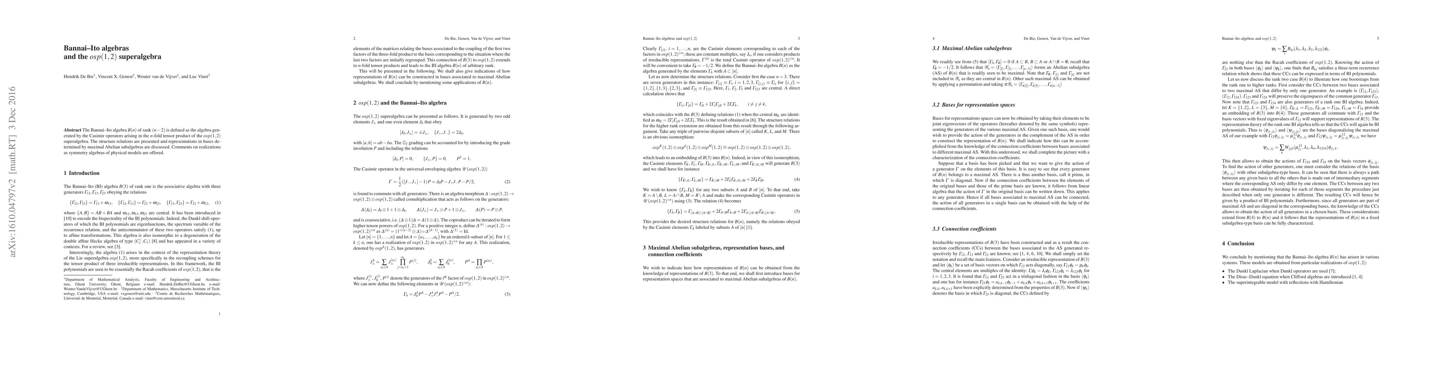 This paper explores the Bannai-Ito algebra $B(n)$, generated by Casimir operators from the $n$-fold tensor product of the $osp(1,2)$ superalgebra, detailing its structure relations and representations based on maximal Abelian subalgebras. It also discusses potential physical model symmetries associated with these algebras.