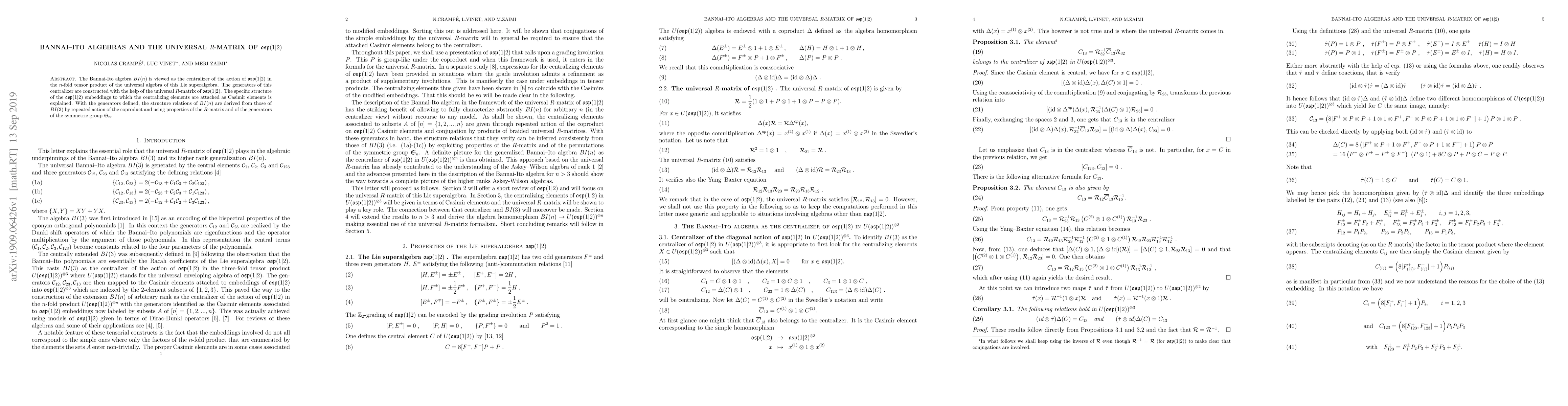 The Bannai-Ito algebra $BI(n)$ is viewed as the centralizer of the action of $\mathfrak{osp}(1|2)$ in the $n$-fold tensor product of the universal algebra of this Lie superalgebra. The generators of this centralizer are constructed with the help of the universal $R$-matrix of $\mathfrak{osp}(1|2)$. The specific structure of the $\mathfrak{osp}(1|2)$ embeddings to which the centralizing elements are attached as Casimir elements is explained. With the generators defined, the structure relations of $BI(n)$ are derived from those of $BI(3)$ by repeated action of the coproduct and using properties of the $R$-matrix and of the generators of the symmetric group $\mathfrak S_n$.