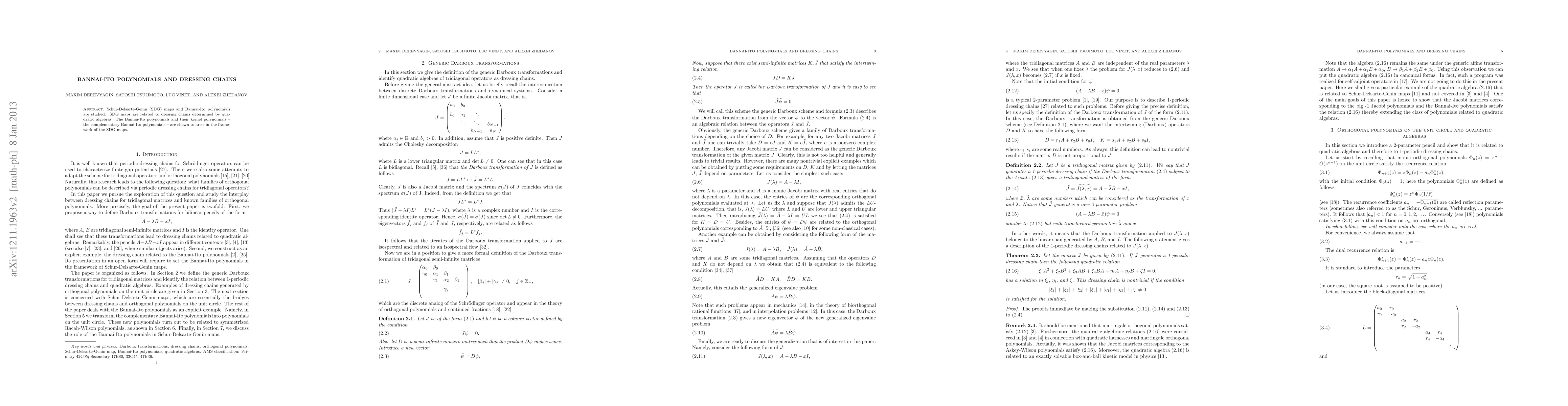 This paper explores the relationship between Schur-Delsarte-Genin (SDG) maps and Bannai-Ito polynomials, demonstrating that the latter arise in the context of dressing chains determined by quadratic algebras, alongside their complementary kernel polynomials.
