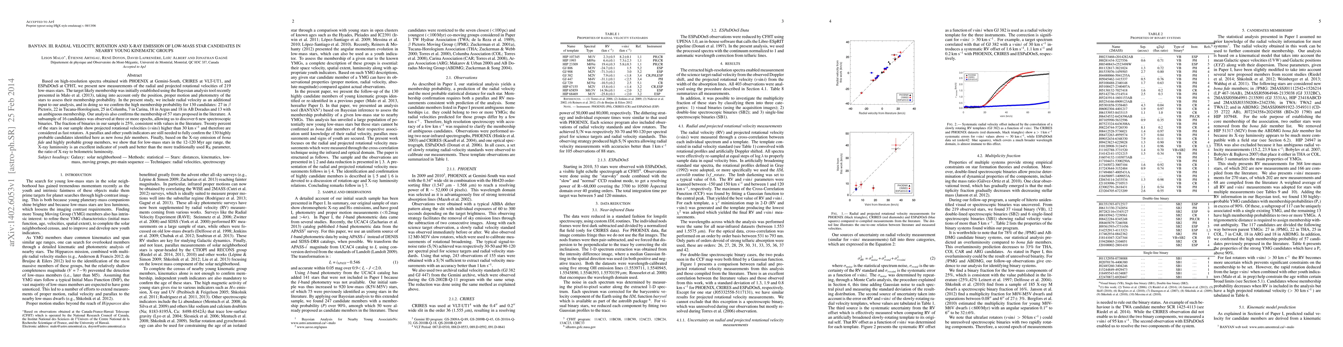 Based on high-resolution spectra obtained with PHOENIX at Gemini-South, CRIRES at VLT-UT1, and ESPaDOnS at CFHT, we present new measurements of the radial and projected rotational velocities of 219 low-mass stars. The target likely membership was initially established using the Bayesian analysis tool recently presented in \citet{2013malo}, taking into account only the position, proper motion and photometry of the stars to assess their membership probability. In the present study, we include radial velocity as an additional input to our analysis, and in doing so we confirm the high membership probability for 130 candidates: 27 in $\beta$ Pictoris, 22 in Tucana-Horologium, 25 in Columba, 7 in Carina, 18 in Argus and 18 in AB Doradus and 13 with an ambiguous membership. Our analysis also confirms the membership of 57 stars proposed in the literature. A subsample of 16 candidates was observed at three or more epochs, allowing us to discover 6 new spectroscopic binaries. The fraction of binaries in our sample is 25%, consistent with values in the literature. Twenty percent of the stars in our sample show projected rotational velocities (\vsini) higher than 30 \kms\ and therefore are considered as fast rotators. A parallax and other youth indicators are still needed to fully confirm the 130 highly probable candidates identified here as new {\it bona fide} members. Finally, based on the X-ray emission of {\it bona fide} and highly probable group members, we show that for low-mass stars in the 12-120 Myr age range, the X-ray luminosity is an excellent indicator of youth and better than the more traditionally used R$_{\rm X}$ parameter, the ratio of X-ray to bolometric luminosity.