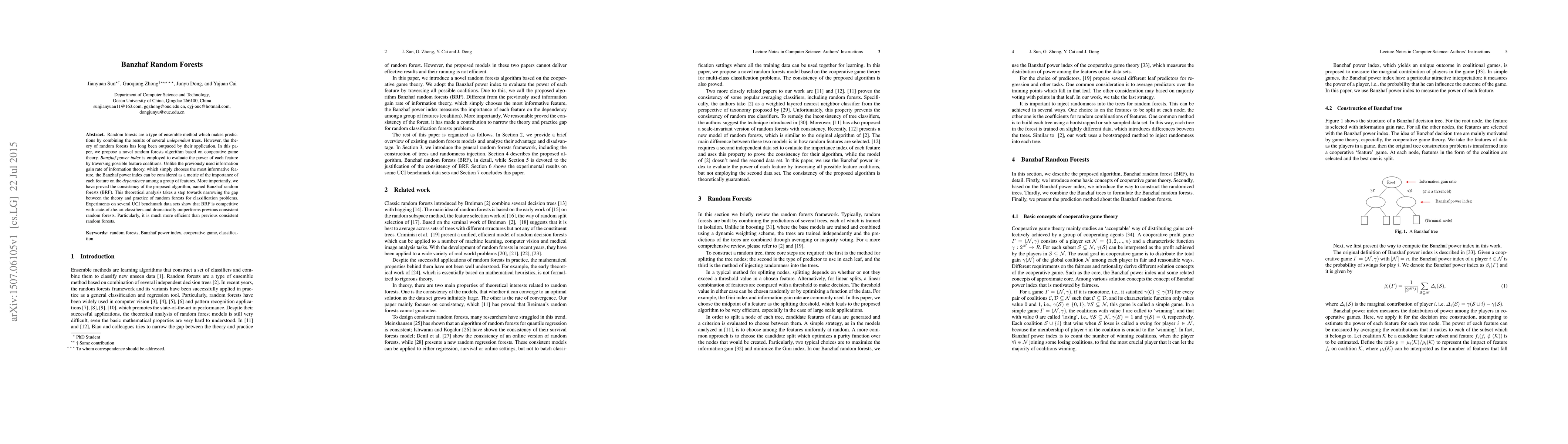 Random forests are a type of ensemble method which makes predictions by combining the results of several independent trees. However, the theory of random forests has long been outpaced by their application. In this paper, we propose a novel random forests algorithm based on cooperative game theory. Banzhaf power index is employed to evaluate the power of each feature by traversing possible feature coalitions. Unlike the previously used information gain rate of information theory, which simply chooses the most informative feature, the Banzhaf power index can be considered as a metric of the importance of each feature on the dependency among a group of features. More importantly, we have proved the consistency of the proposed algorithm, named Banzhaf random forests (BRF). This theoretical analysis takes a step towards narrowing the gap between the theory and practice of random forests for classification problems. Experiments on several UCI benchmark data sets show that BRF is competitive with state-of-the-art classifiers and dramatically outperforms previous consistent random forests. Particularly, it is much more efficient than previous consistent random forests.