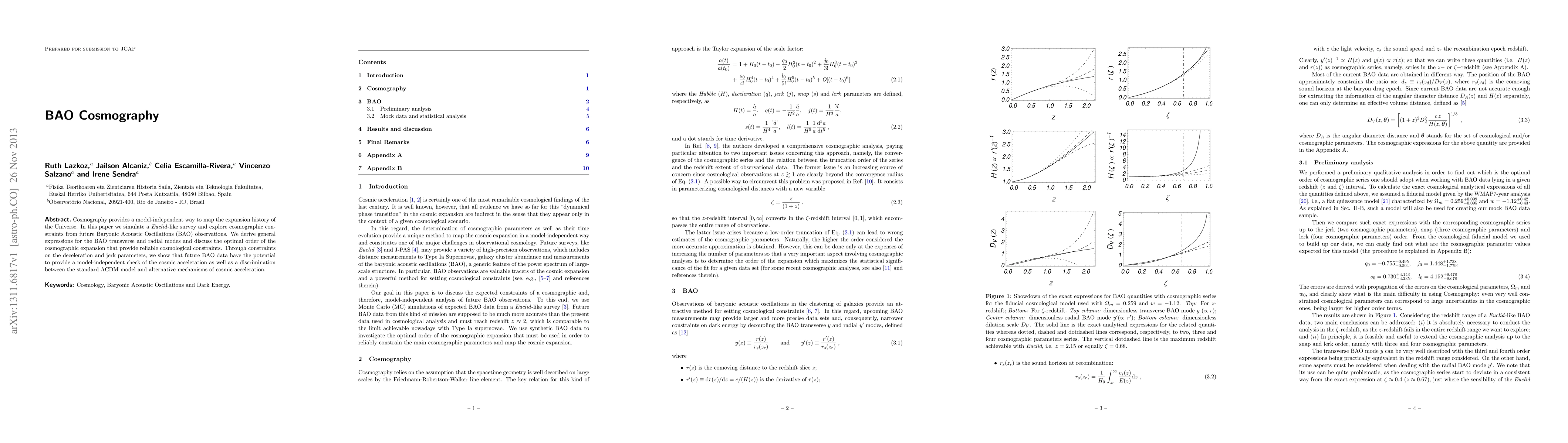 Cosmography provides a model-independent way to map the expansion history of the Universe. In this paper we simulate a Euclid-like survey and explore cosmographic constraints from future Baryonic Acoustic Oscillations (BAO) observations. We derive general expressions for the BAO transverse and radial modes and discuss the optimal order of the cosmographic expansion that provide reliable cosmological constraints. Through constraints on the deceleration and jerk parameters, we show that future BAO data have the potential to provide a model-independent check of the cosmic acceleration as well as a discrimination between the standard $\Lambda$CDM model and alternative mechanisms of cosmic acceleration.