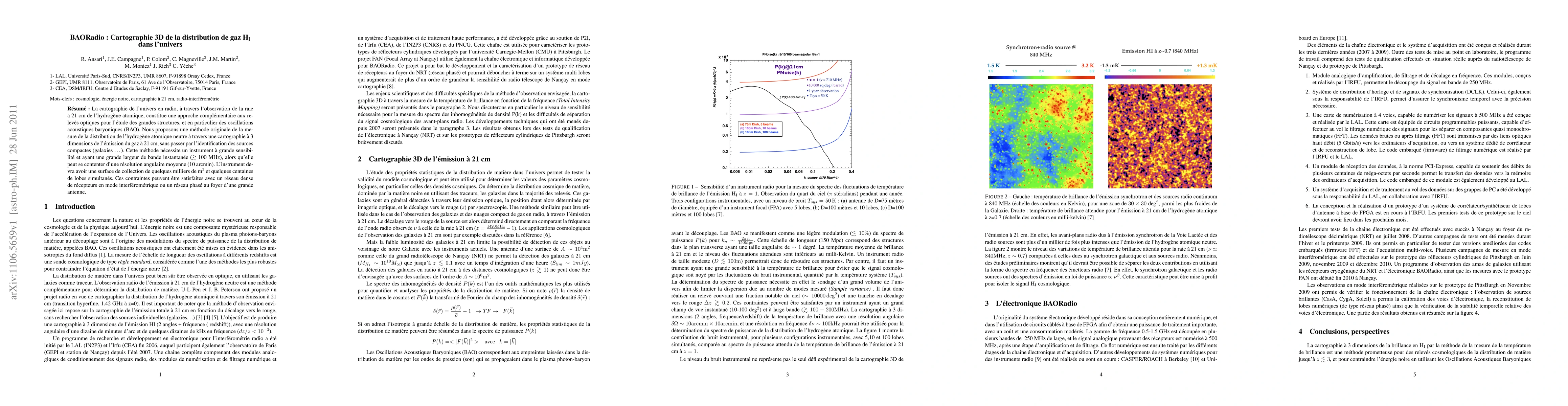 3D mapping of matter distribution in the universe through the 21 cm radio emission of atomic hydrogen is a complementary approach to optical surveys for the study of the Large Scale Structures, in particular for measuring the BAO (Baryon Acoustic Oscillation) scale up to redshifts z <~ 3 and constrain dark energy. We propose to carry such a survey through a novel method, called intensity mapping, without detecting individual galaxies radio emission. This method requires a wide band instrument, 100 MHz or larger, and multiple beams, while a rather modest angular resolution of 10 arcmin would be sufficient. The instrument would have a few thousand square meters of collecting area and few hundreds of simultaneous beams. These constraints could be fulfilled with a dense array of receivers in interferometric mode, or a phased array at the focal plane of a large antenna.