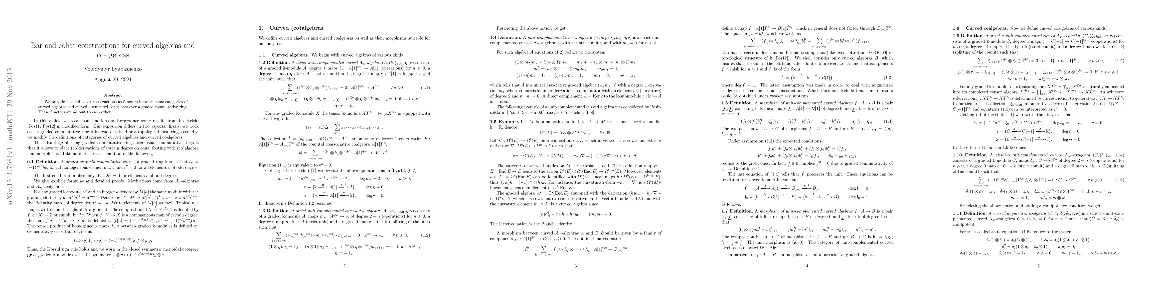 Summary: This paper introduces bar and cobar constructions as adjoint functors between categories of curved algebras and curved augmented coalgebras over a graded commutative ring, providing a framework for their application in algebraic structures.
