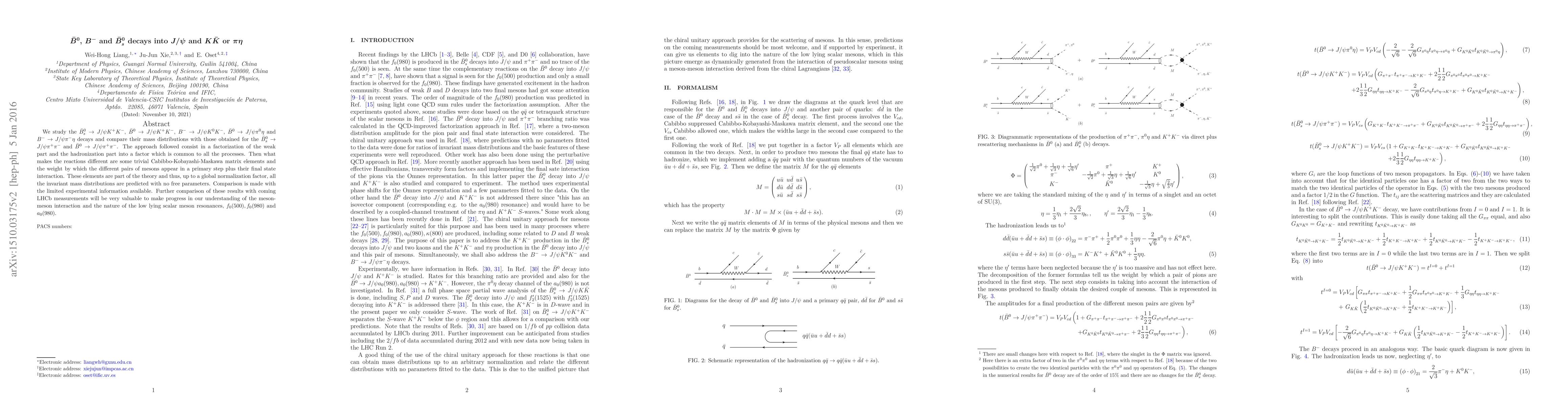 This paper investigates the decay patterns of $\bar B^0$, $B^-$, and $\bar B^0_s$ mesons into $J/\psi$ combined with $K \bar K$ or $\pi \eta$ final states, comparing their mass distributions to those of similar decays involving $\pi^+ \pi^-$. The theoretical framework predicts the invariant mass distributions without free parameters, focusing on Cabibbo-Kobayashi-Maskawa matrix elements and final state interactions. Experimental comparisons are limited, but future LHCb measurements could provide insights into meson interactions and low-lying scalar resonances.