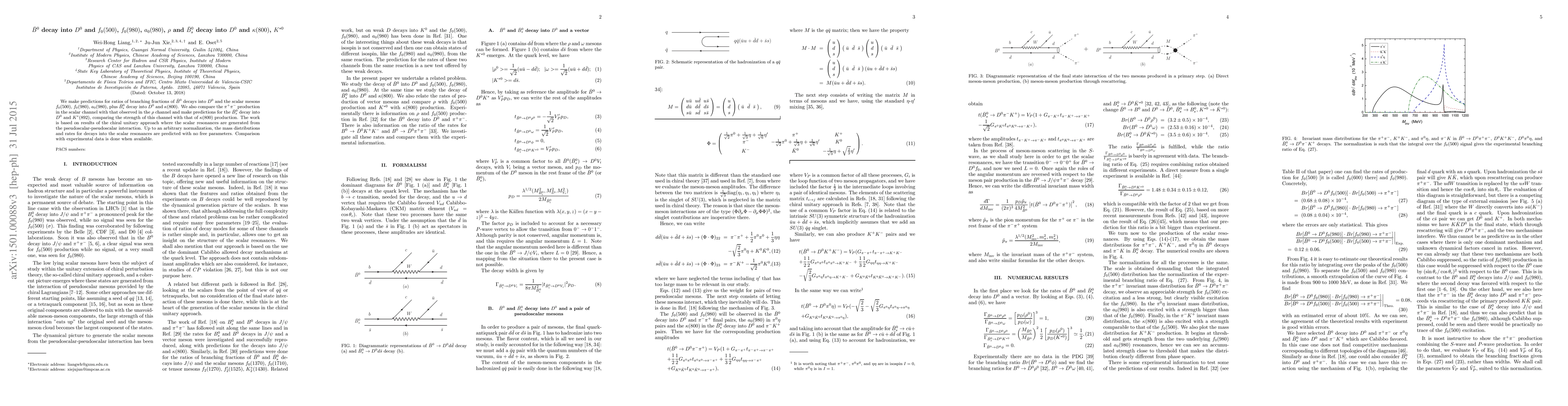 This paper predicts branching fractions for $\bar B^0$ and $\bar B^0_s$ decays involving $D^0$ mesons and various scalar resonances, using the chiral unitary approach. It also compares $\pi^+ \pi^-$ production in scalar versus $\rho$ channels and predicts the strength of $\bar B^0_s$ decay into $D^0$ and $K^*(892)$.