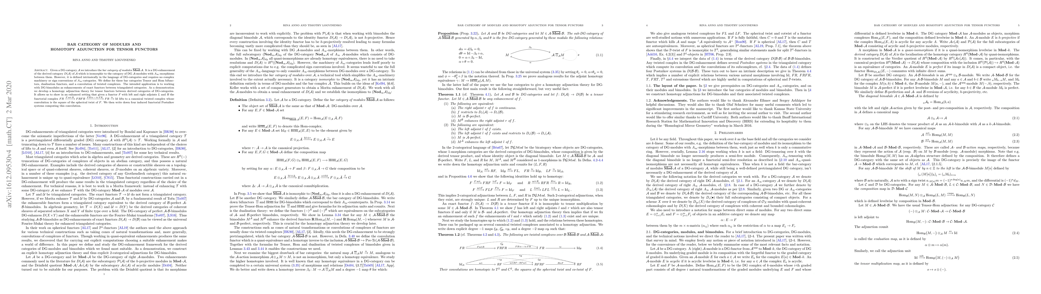 This paper introduces a bar category of modules and develops homotopy adjunction theory for tensor functors between derived categories of DG-categories, enabling the study of DG-bimodules as enhancements of exact functors.