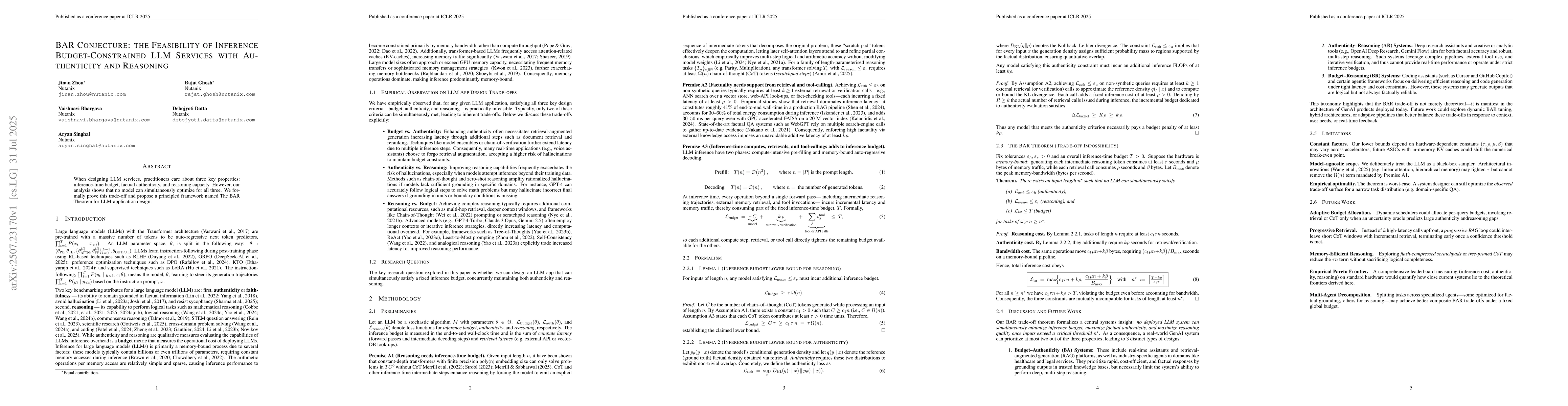 When designing LLM services, practitioners care about three key properties: inference-time budget, factual authenticity, and reasoning capacity. However, our analysis shows that no model can simultaneously optimize for all three. We formally prove this trade-off and propose a principled framework named The BAR Theorem for LLM-application design.