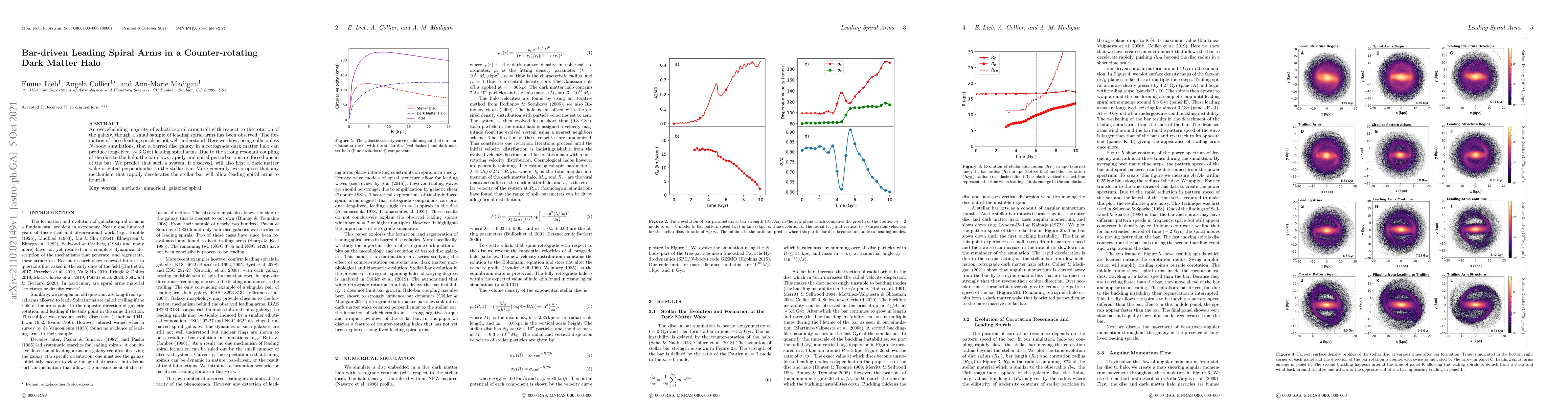 This paper demonstrates through simulations that a barred galaxy in a counter-rotating dark matter halo can generate long-lived leading spiral arms due to resonant coupling, with the bar slowing down and forcing spiral perturbations ahead. It suggests that such systems may also exhibit a dark matter wake perpendicular to the stellar bar.