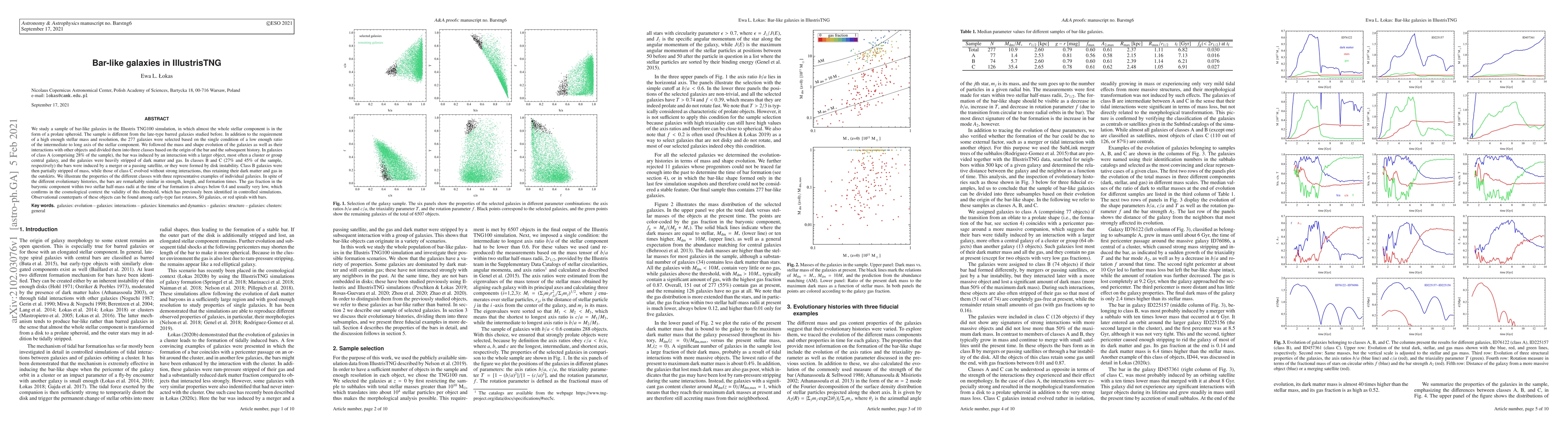 We study a sample of bar-like galaxies in the Illustris TNG100 simulation, in which almost the whole stellar component is in the form of a prolate spheroid. The sample is different from the late-type barred galaxies studied before. In addition to the requirement of a high enough stellar mass and resolution, the 277 galaxies were selected based on the single condition of a low enough ratio of the intermediate to long axis of the stellar component. We followed the mass and shape evolution of the galaxies as well as their interactions with other objects and divided them into three classes based on the origin of the bar and the subsequent history. In galaxies of class A (comprising 28% of the sample), the bar was induced by an interaction with a larger object, most often a cluster or group central galaxy, and the galaxies were heavily stripped of dark matter and gas. In classes B and C (27% and 45% of the sample, respectively) the bars were induced by a merger or a passing satellite, or they were formed by disk instability. Class B galaxies were then partially stripped of mass, while those of class C evolved without strong interactions, thus retaining their dark matter and gas in the outskirts. We illustrate the properties of the different classes with three representative examples of individual galaxies. In spite of the different evolutionary histories, the bars are remarkably similar in strength, length, and formation times. The gas fraction in the baryonic component within two stellar half-mass radii at the time of bar formation is always below 0.4 and usually very low, which confirms in the cosmological context the validity of this threshold, which has previously been identified in controlled simulations. Observational counterparts of these objects can be found among early-type fast rotators, S0 galaxies, or red spirals with bars.