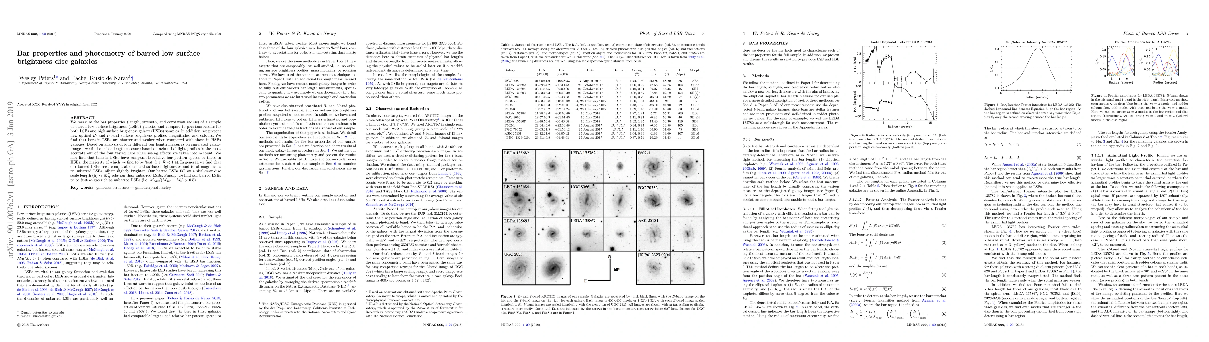 We measure the bar properties (length, strength, and corotation radius) of a sample of barred low surface brightness (LSBs) galaxies and compare to previous results for both LSBs and high surface brightness galaxy (HSBs) samples. In addition, we present new optical $\textit{B}$- and $\textit{I}$-band surface brightness profiles, magnitudes, and colours. We find that bars in LSBs are shorter and weaker when compared with those in HSBs galaxies. Based on analysis of four different bar length measures on simulated galaxy images, we find our bar length measure based on azimuthal light profiles is the most accurate out of the four tested here when seeing effects are taken into account. We also find that bars in LSBs have comparable relative bar pattern speeds to those in HSBs, the majority of which we find to be `fast' (i.e. $\mathcal{R} <$ 1.4). In general, we find that our barred LSBs have comparable central surface brightnesses and total magnitudes to unbarred LSBs, albeit slightly brighter. Our barred LSBs fall on a shallower disc scale length (h) vs $M_{B}^{T}$ relation than unbarred LSBs. Finally, we find our barred LSBs to be just as gas rich as unbarred LSBs (i.e. $M_{gas}/(M_{gas} + M_{*}) > 0.5$).