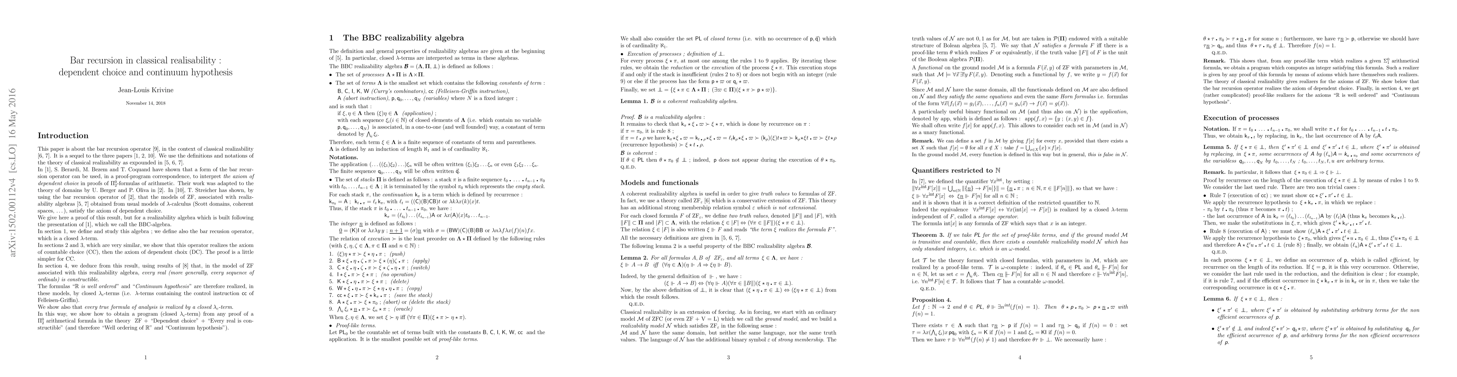 This paper proves that bar recursion in classical realizability models satisfies the axiom of dependent choice, the well-ordering of the real numbers, and the continuum hypothesis, demonstrating how these properties are realized by closed λ_c-terms. This enables the derivation of programs from proofs of arithmetical formulas using these axioms.