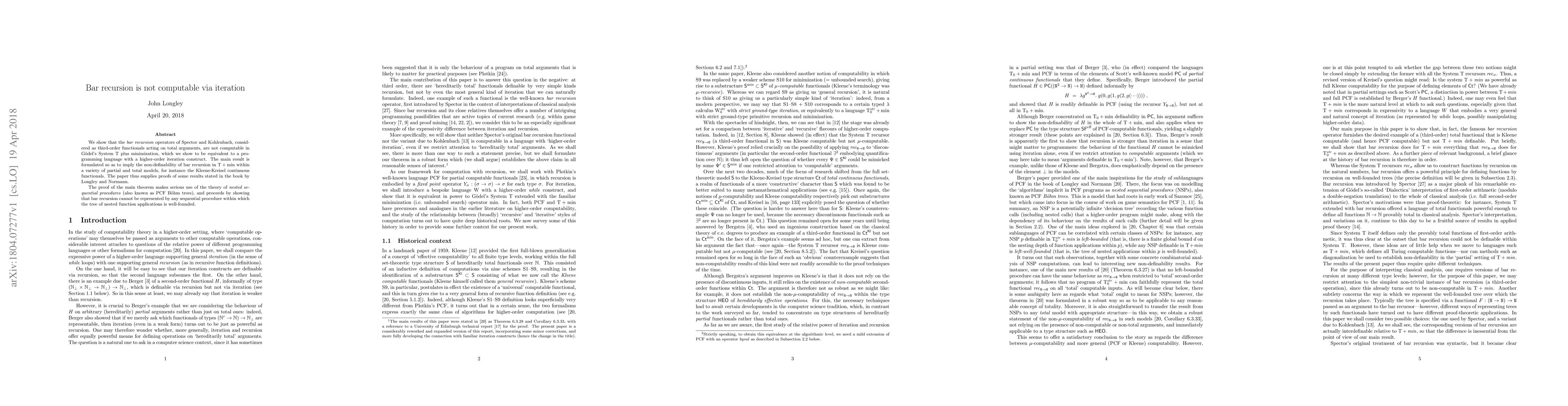 We show that the bar recursion operators of Spector and Kohlenbach, considered as third-order functionals acting on total arguments, are not computable in Goedel's System T plus minimization, which we show to be equivalent to a programming language with a higher-order iteration construct. The main result is formulated so as to imply the non-definability of bar recursion in T + min within a variety of partial and total models, for instance the Kleene-Kreisel continuous functionals. The paper thus supplies proofs of some results stated in the book by Longley and Normann. The proof of the main theorem makes serious use of the theory of nested sequential procedures (also known as PCF Boehm trees), and proceeds by showing that bar recursion cannot be represented by any sequential procedure within which the tree of nested function applications is well-founded.