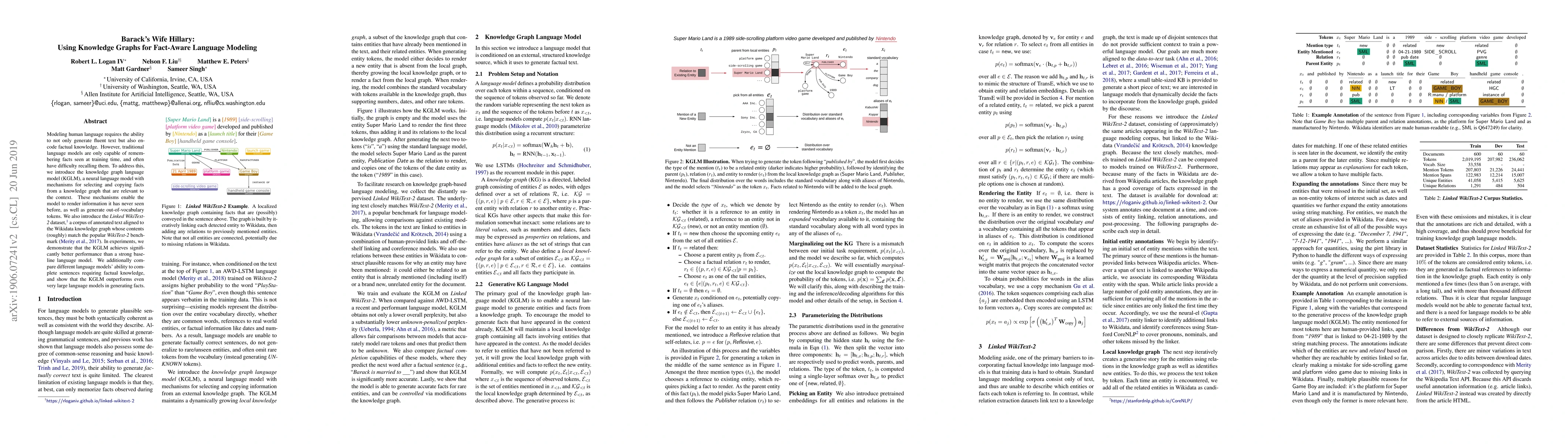 The paper introduces the knowledge graph language model (KGLM) to encode factual knowledge in language modeling, enabling it to generate text based on unseen facts and out-of-vocabulary tokens. The KGLM outperforms traditional models in factual knowledge completion tasks, as demonstrated using the Linked WikiText-2 dataset.