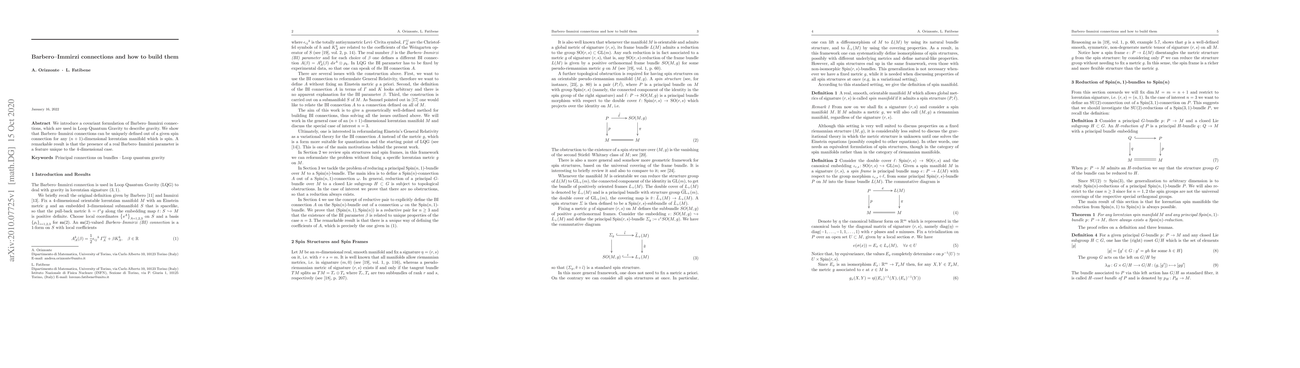 This paper presents a covariant formulation of Barbero-Immirzi connections used in Loop Quantum Gravity to describe gravity, demonstrating their unique definition from a given spin connection in any spin $(n+1)$-dimensional Lorentzian manifold, with a special emphasis on the unique feature of the $4$-dimensional case.