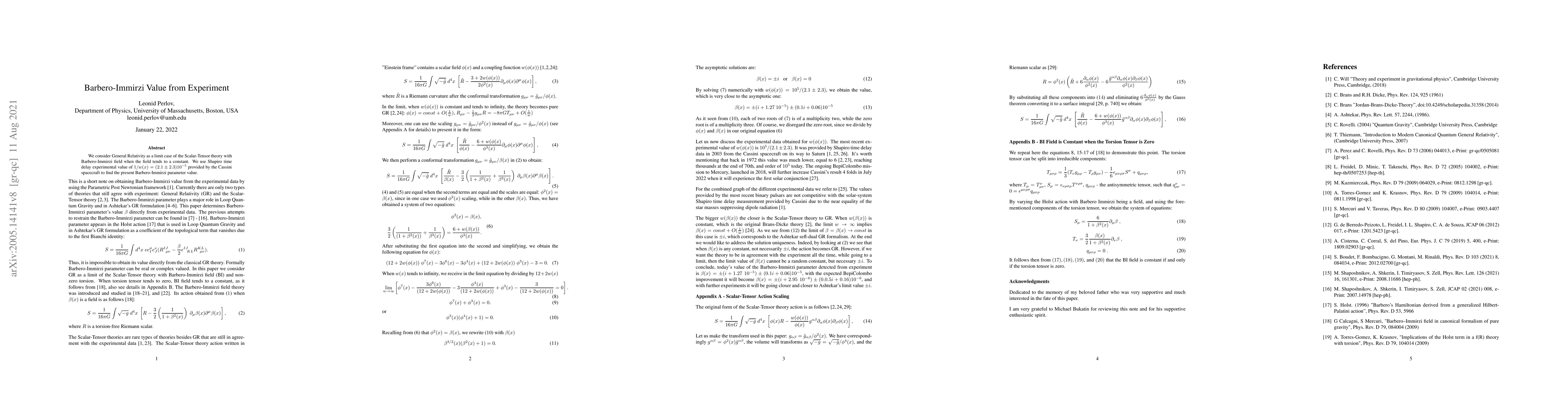 The study investigates General Relativity as a limit of Scalar-Tensor theory with a Barbero-Immirzi field, using experimental Shapiro time delay data from the Cassini spacecraft to determine the Barbero-Immirzi parameter value. The derived limit is $1/w = (2.1 \pm 2.3) \times 10^{-5}$.