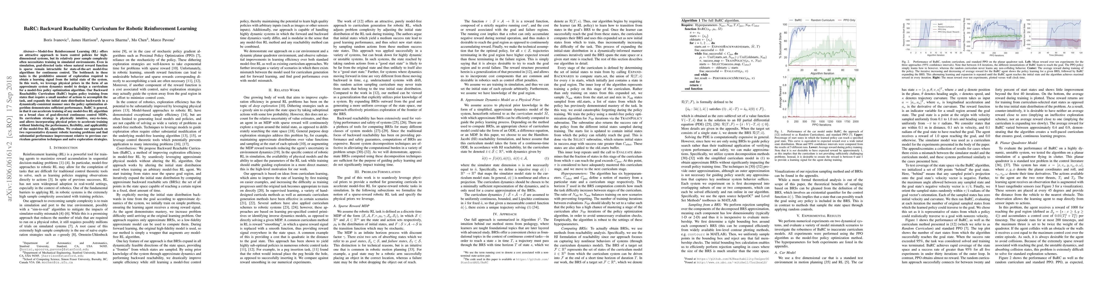 The paper introduces BaRC, a Backward Reachability Curriculum for accelerating model-free Reinforcement Learning in robotic control tasks. BaRC starts training from simple states requiring fewer actions and gradually expands the complexity, leveraging physical priors to enhance sample efficiency and performance.