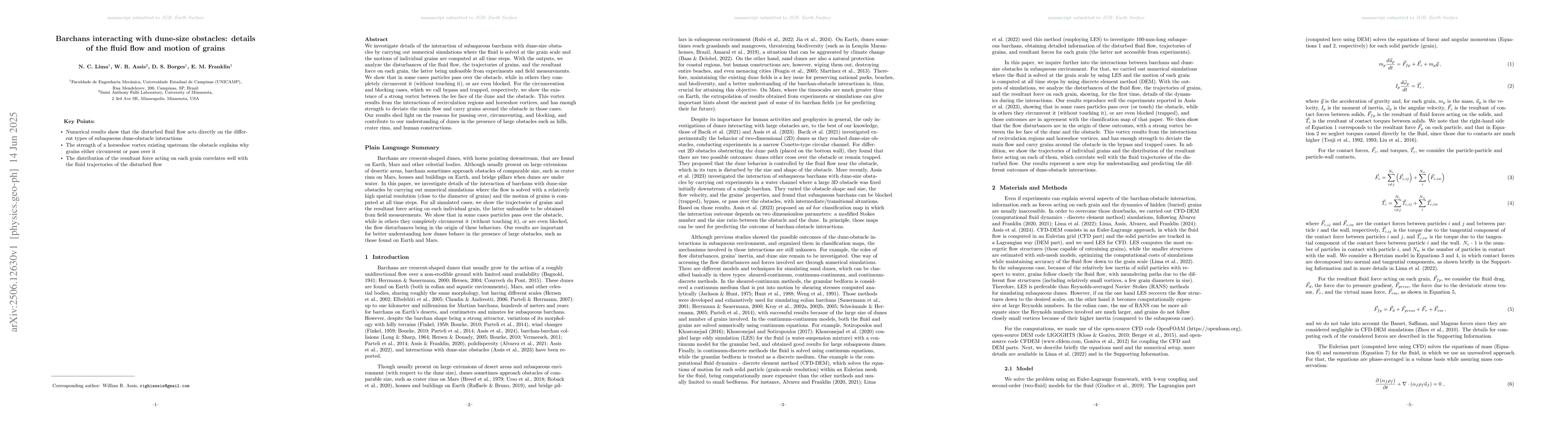 We investigate details of the interaction of subaqueous barchans with dune-size obstacles by carrying out numerical simulations where the fluid is solved at the grain scale and the motions of individual grains are computed at all time steps. With the outputs, we analyze the disturbances of the fluid flow, the trajectories of grains, and the resultant force on each grain, the latter being unfeasible from experiments and field measurements. We show that in some cases particles pass over the obstacle, while in others they completely circumvent it (without touching it), or are even blocked. For the circumvention and blocking cases, which we call bypass and trapped, respectively, we show the existence of a strong vortex between the lee face of the dune and the obstacle. This vortex results from the interactions of recirculation regions and horseshoe vortices, and has enough strength to deviate the main flow and carry grains around the obstacle in those cases. Our results shed light on the reasons for passing over, circumventing, and blocking, and contribute to our understanding of dunes in the presence of large obstacles such as hills, crater rims, and human constructions.