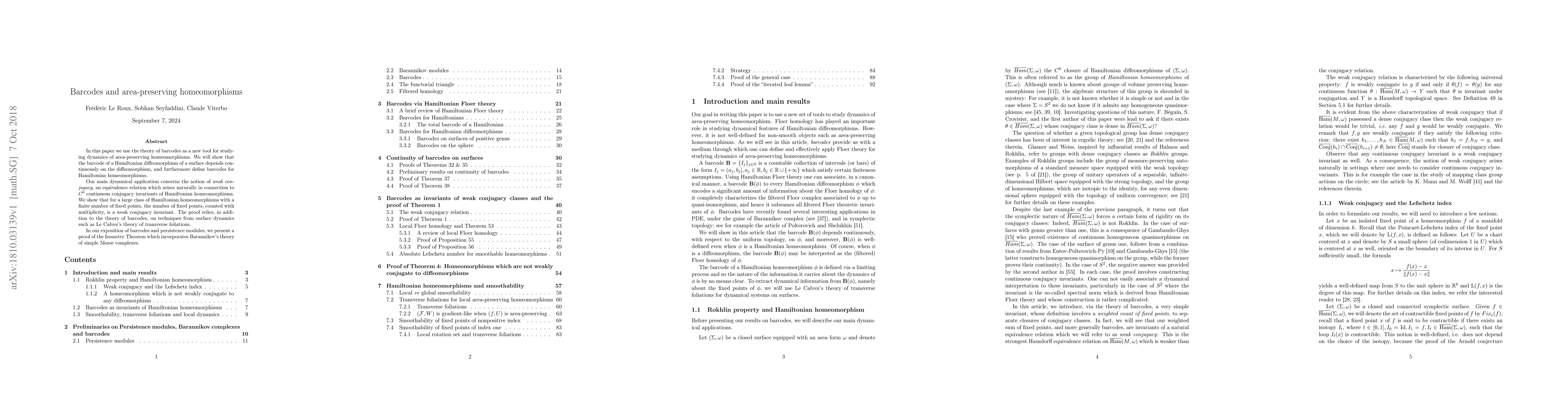 This paper introduces barcodes as a novel method to analyze the dynamics of area-preserving homeomorphisms, showing continuous dependence on Hamiltonian diffeomorphisms. It demonstrates that the number of fixed points, counted with multiplicity, is a weak conjugacy invariant for a broad class of Hamiltonian homeomorphisms, supported by techniques from surface dynamics and Barannikov's theory.