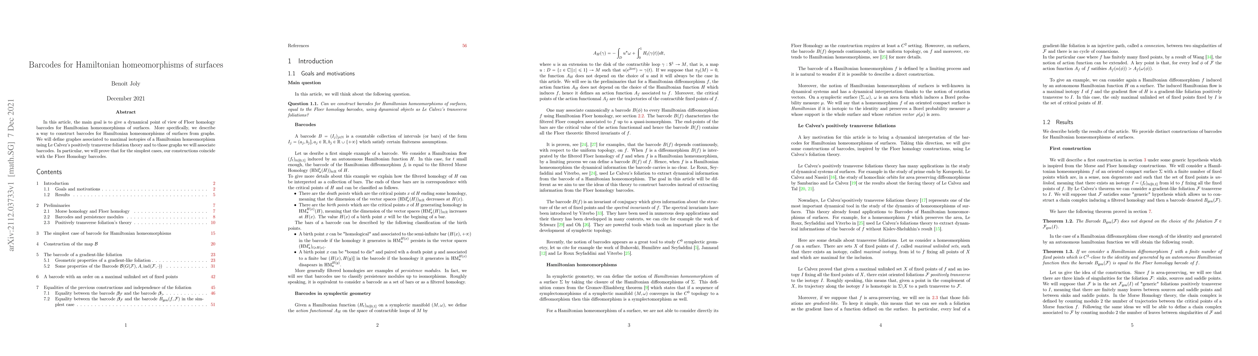 This paper introduces a method to construct dynamical barcodes for Hamiltonian homeomorphisms of surfaces using graphs derived from maximal isotopies and Le Calvez's foliation theory, showing that these coincide with Floer Homology barcodes in simple cases.