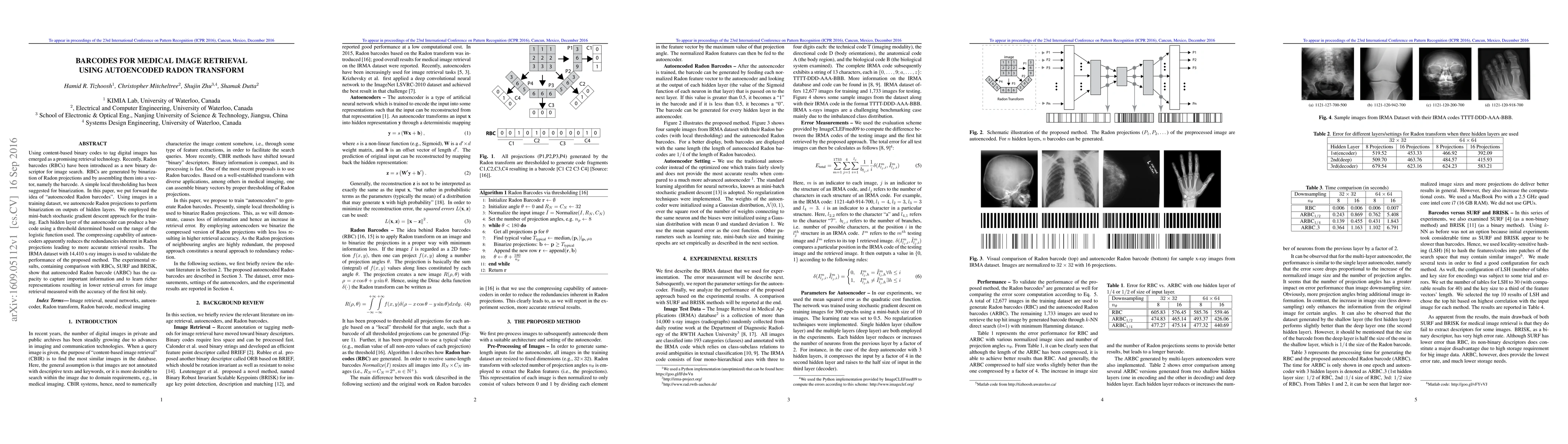 The paper proposes autoencoded Radon barcodes (ARBC) for medical image retrieval, utilizing autoencoders to binarize Radon projections, reducing redundancies and improving retrieval accuracy. The method is validated using the IRMA dataset of 14,410 x-ray images.