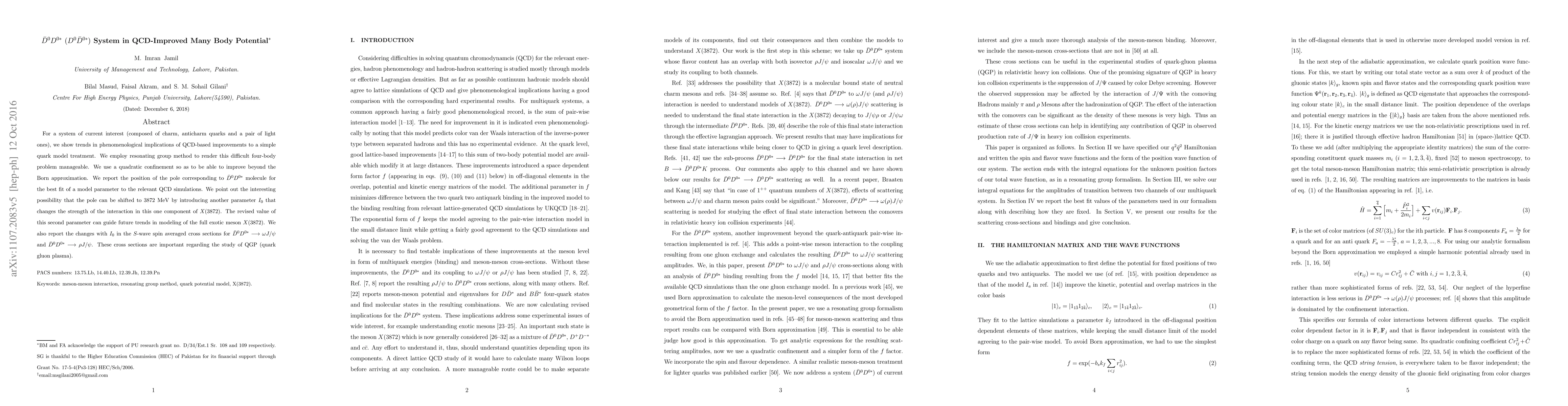 For a system of current interest (composed of charm, anticharm quarks and a pair of light ones), we show trends in phenomenological implications of QCD-based improvements to a simple quark model treatment. We employ resonating group method to render this difficult four-body problem manageable. We use a quadratic confinement so as to be able to improve beyond the Born approximation. We report the position of the pole corresponding to $\bar{D}^{0}D^{0*}$ molecule for the best fit of a model parameter to the relevant QCD simulations. We point out the interesting possibility that the pole can be shifted to $3872$ MeV by introducing another parameter $I_{0}$ that changes the strength of the interaction in this one component of $X(3872)$. The revised value of this second parameter can guide future trends in modeling of the full exotic meson $X(3872)$. We also report the changes with $I_{0}$ in the $S$-wave spin averaged cross sections for $\bar{D}^{0}D^{0*}\longrightarrow\omega J/\psi$ and $\bar{D}^{0}D^{0*}\longrightarrow\rho J/\psi$. These cross sections are important regarding the study of QGP (quark gluon plasma).