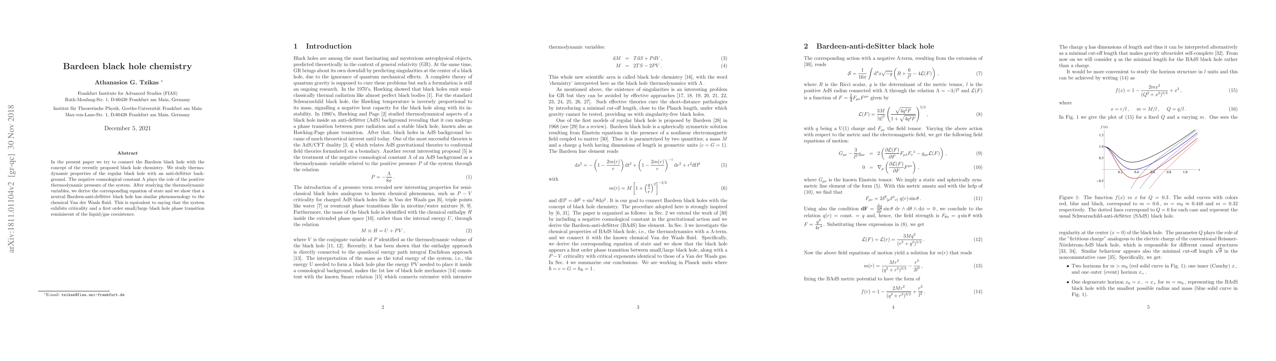 In the present paper we try to connect the Bardeen black hole with the concept of the recently proposed black hole chemistry. We study thermodynamic properties of the regular black hole with an anti-deSitter background. The negative cosmological constant $\Lambda$ plays the role of the positive thermodynamic pressure of the system. After studying the thermodynamic variables, we derive the corresponding equation of state and we show that a neutral Bardeen-anti-deSitter black hole has similar phenomenology to the chemical Van der Waals fluid. This is equivalent to saying that the system exhibits criticality and a first order small/large black hole phase transition reminiscent of the liquid/gas coexistence.