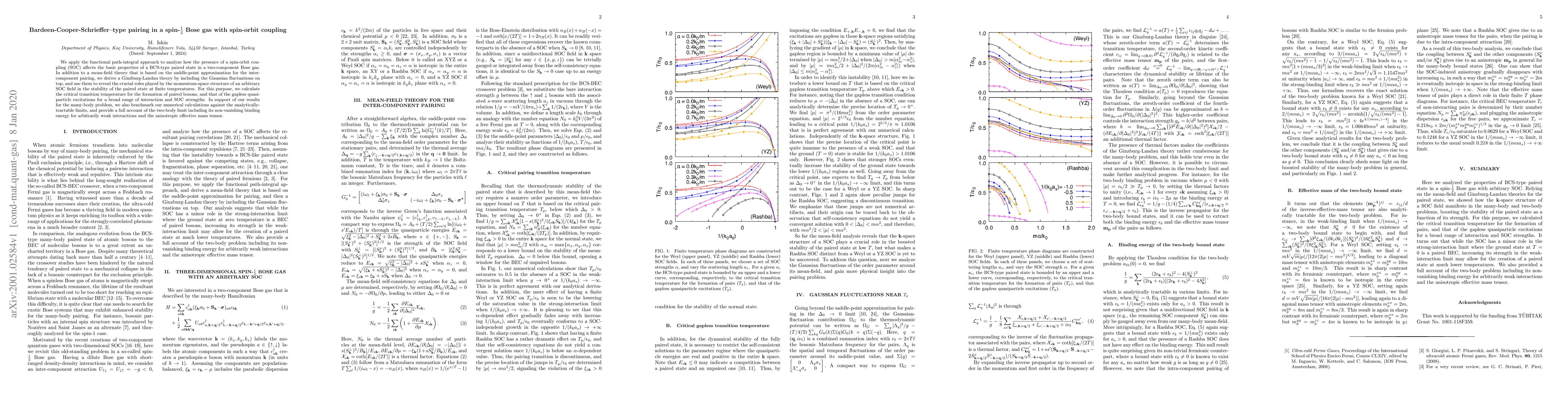 We apply the functional path-integral approach to analyze how the presence of a spin-orbit coupling (SOC) affects the basic properties of a BCS-type paired state in a two-component Bose gas. In addition to a mean-field theory that is based on the saddle-point approximation for the inter-component pairing, we derive a Ginzburg-Landau theory by including the Gaussian fluctuations on top, and use them to reveal the crucial roles played by the momentum-space structure of an arbitrary SOC field in the stability of the paired state at finite temperatures. For this purpose, we calculate the critical transition temperature for the formation of paired bosons, and that of the gapless quasiparticle excitations for a broad range of interaction and SOC strengths. In support of our results for the many-body problem, we also benchmark our numerical calculations against the analytically-tractable limits, and provide a full account of the two-body limit including its non-vanishing binding energy for arbitrarily weak interactions and the anisotropic effective mass tensor.