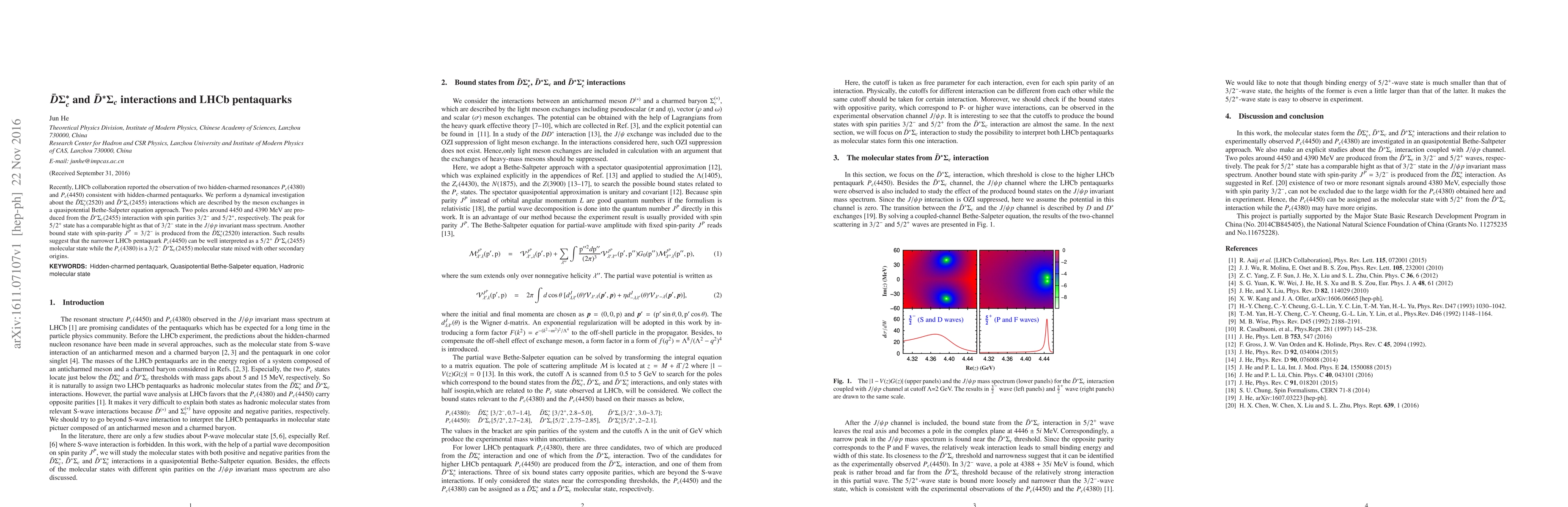 This paper investigates the interactions between $\bar{D}\Sigma^*_c$ and $\bar{D}^*\Sigma_c$ particles using a quasipotential Bethe-Salpeter equation approach, finding two poles consistent with LHCb's pentaquarks $P_c(4380)$ and $P_c(4450)$. The study suggests that $P_c(4450)$ is a $5/2^+$ $\bar{D}^*\Sigma_c$ molecular state, while $P_c(4380)$ is a $3/2^-$ $\bar{D}^*\Sigma_c$ state with additional influences.
