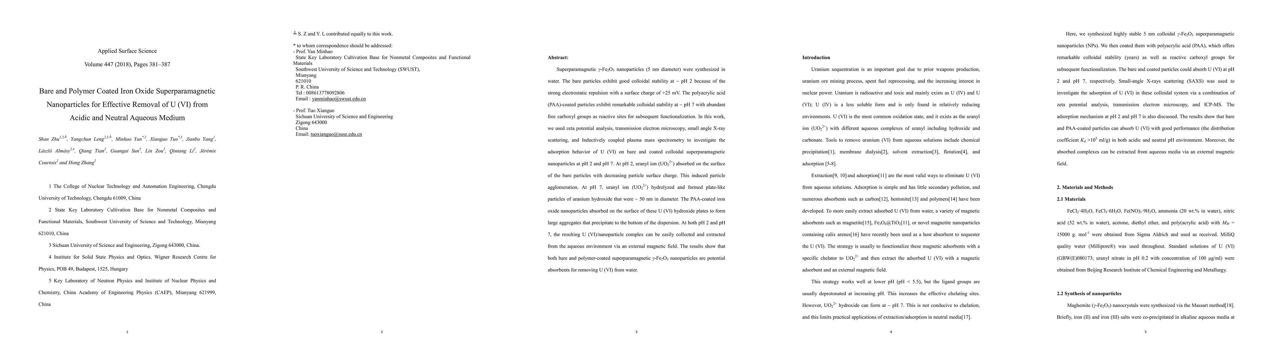 This study synthesizes bare and polyacrylic acid-coated superparamagnetic γ-Fe2O3 nanoparticles for U(VI) removal from water. The bare nanoparticles effectively adsorb U(VI) at pH 2, while coated particles form large aggregates with U(VI) hydroxide at pH 7, both facilitating easy magnetic separation.