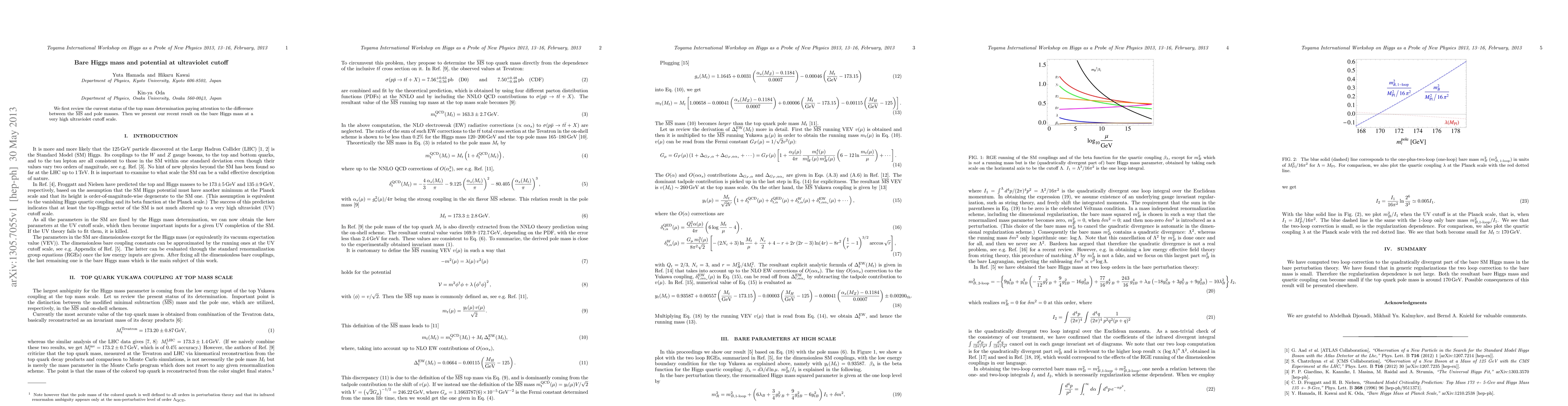 We first review the current status of the top mass determination paying attention to the difference between the MS-bar and pole masses. Then we present our recent result on the bare Higgs mass at a very high ultraviolet cutoff scale.