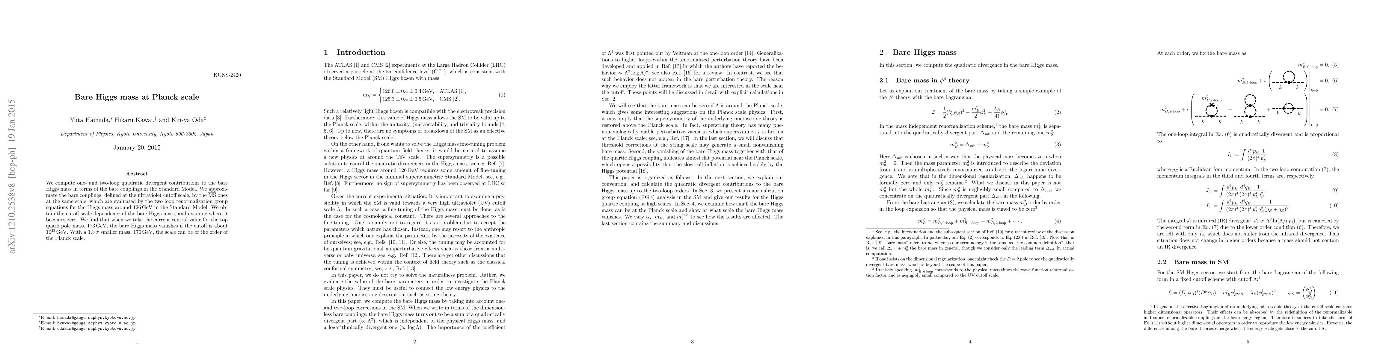 Researchers find that the bare Higgs mass becomes zero at a cutoff scale of around 10^23 GeV if using the current top quark pole mass, but can be near the Planck scale with a slightly smaller mass.