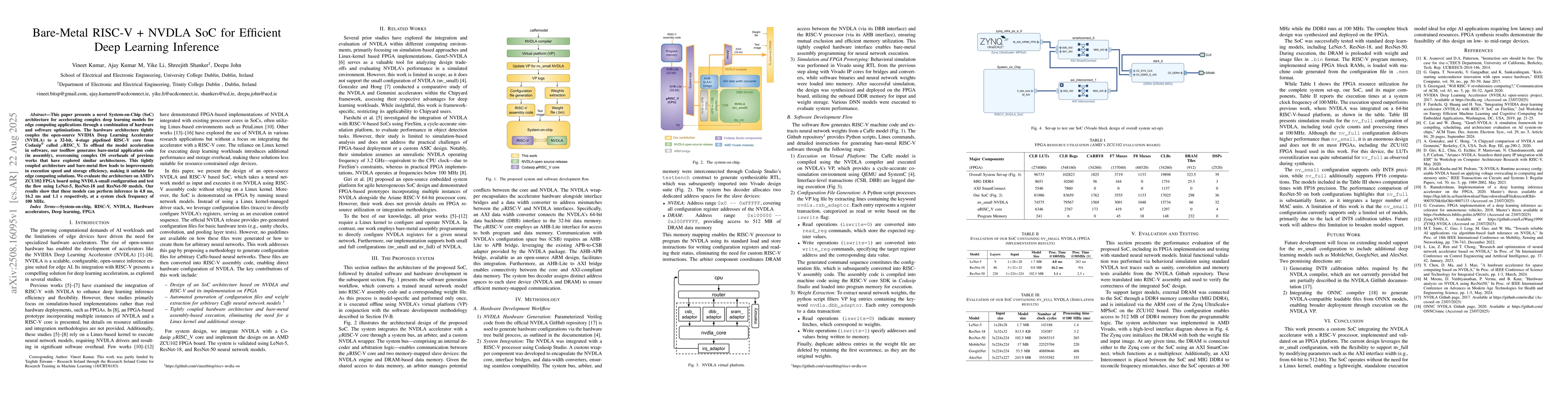 This paper presents a novel System-on-Chip (SoC) architecture for accelerating complex deep learning models for edge computing applications through a combination of hardware and software optimisations. The hardware architecture tightly couples the open-source NVIDIA Deep Learning Accelerator (NVDLA) to a 32-bit, 4-stage pipelined RISC-V core from Codasip called uRISC_V. To offload the model acceleration in software, our toolflow generates bare-metal application code (in assembly), overcoming complex OS overheads of previous works that have explored similar architectures. This tightly coupled architecture and bare-metal flow leads to improvements in execution speed and storage efficiency, making it suitable for edge computing solutions. We evaluate the architecture on AMD's ZCU102 FPGA board using NVDLA-small configuration and test the flow using LeNet-5, ResNet-18 and ResNet-50 models. Our results show that these models can perform inference in 4.8 ms, 16.2 ms and 1.1 s respectively, at a system clock frequency of 100 MHz.