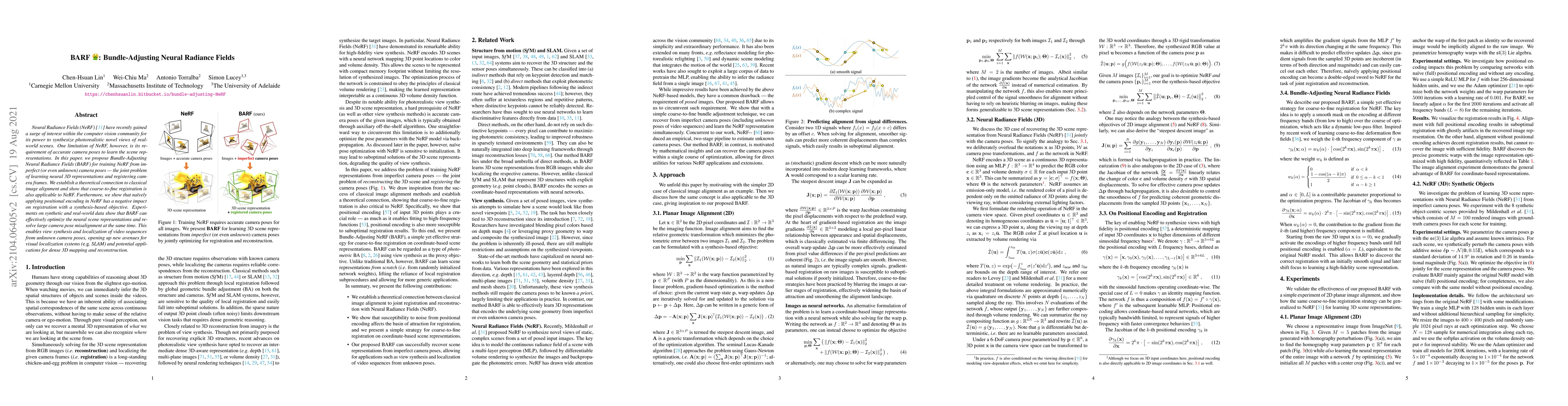 This paper introduces Bundle-Adjusting Neural Radiance Fields (BARF) to train NeRF from imperfect camera poses, enabling joint learning of neural 3D representations and camera frame registration. BARF optimizes neural scene representations and resolves large camera pose misalignments, facilitating view synthesis and localization in video sequences.