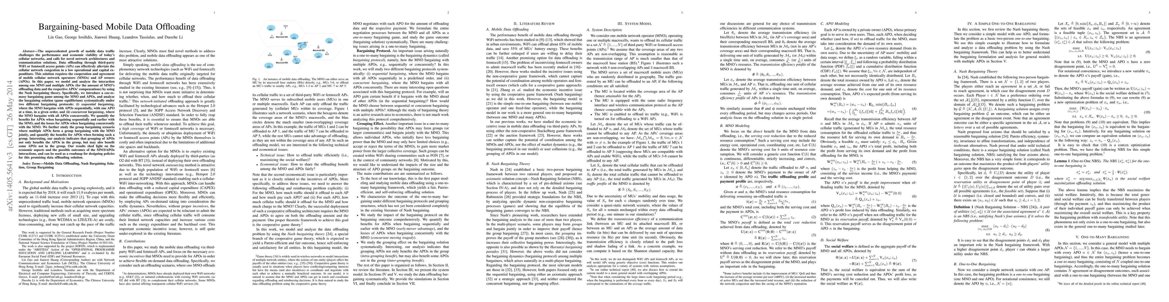 This paper models the interaction between mobile network operators (MNOs) and WiFi/femtocell access point owners (APOs) using Nash bargaining theory to negotiate data offloading. It analyzes bargaining outcomes under sequential and concurrent protocols, and finds that APOs benefit more from sequential bargaining and forming joint groups, which can also indirectly benefit non-group members.