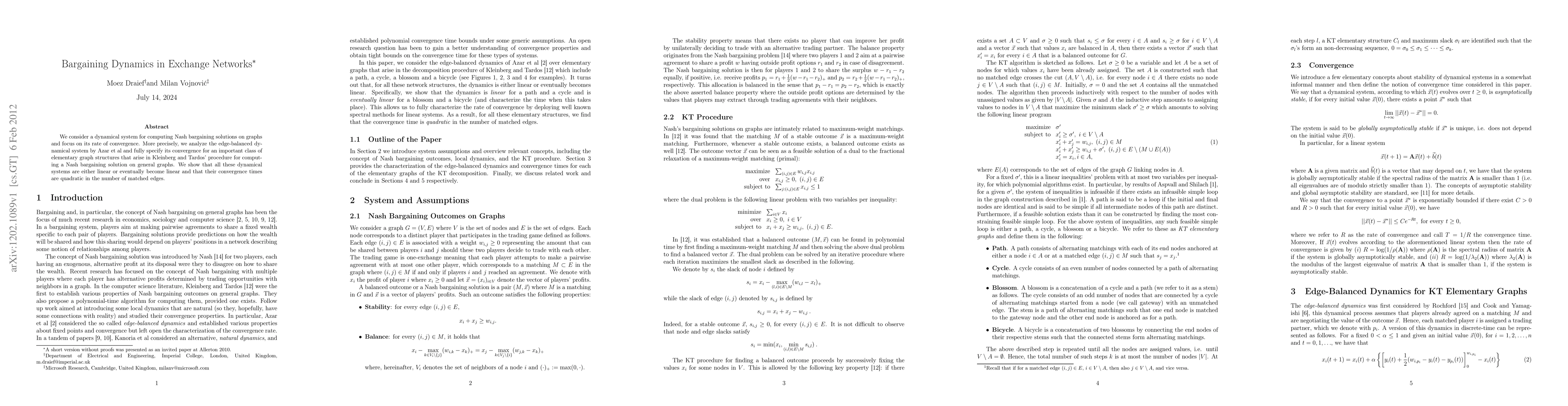 This paper examines a dynamical system for computing Nash bargaining solutions on graphs, focusing on its convergence rate. It demonstrates that the edge-balanced dynamical system converges either linearly or eventually linearly, with the convergence time being quadratic in the number of matched edges.