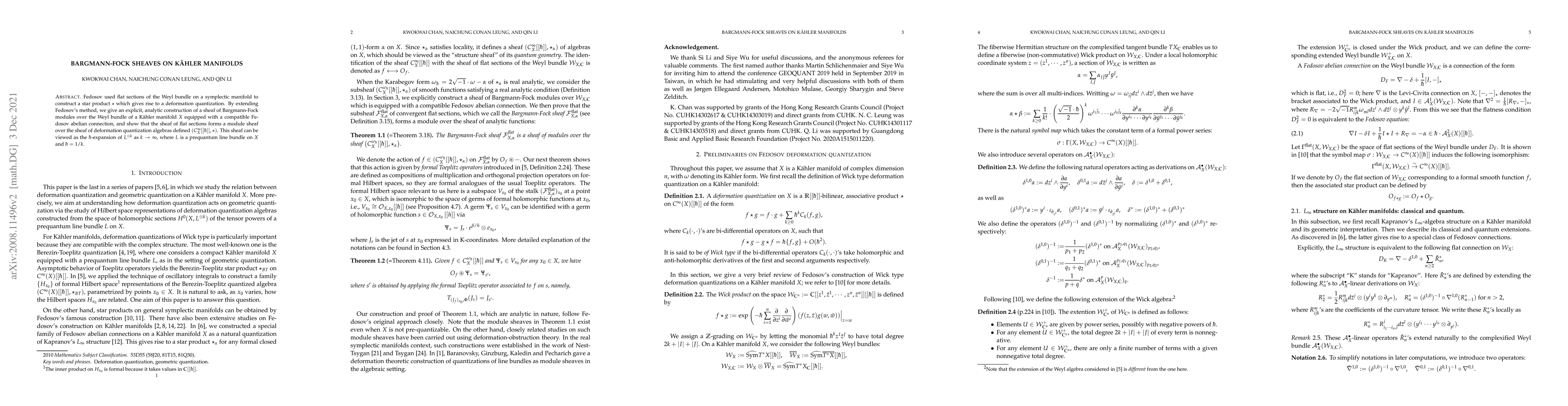 Fedosov used flat sections of the Weyl bundle on a symplectic manifold to construct a star product $\star$ which gives rise to a deformation quantization. By extending Fedosov's method, we give an explicit, analytic construction of a sheaf of Bargmann-Fock modules over the Weyl bundle of a K\"ahler manifold $X$ equipped with a compatible Fedosov abelian connection, and show that the sheaf of flat sections forms a module sheaf over the sheaf of deformation quantization algebras defined $(C^\infty_X[[\hbar]], \star)$. This sheaf can be viewed as the $\hbar$-expansion of $L^{\otimes k}$ as $k \to \infty$, where $L$ is a prequantum line bundle on $X$ and $\hbar = 1/k$.