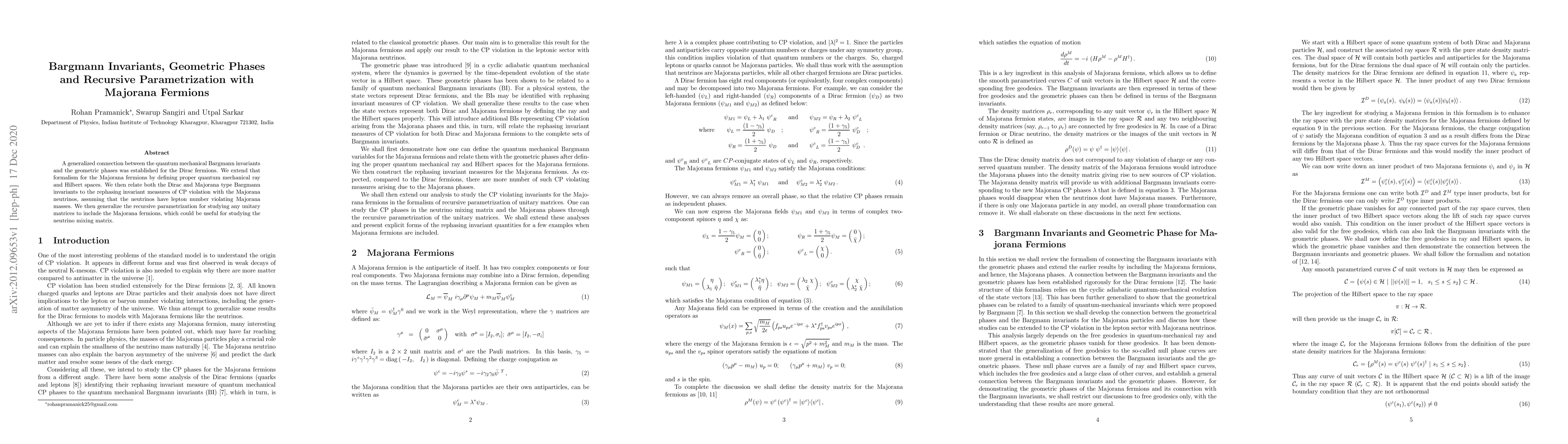 A generalized connection between the quantum mechanical Bargmann invariants and the geometric phases was established for the Dirac fermions. We extend that formalism for the Majorana fermions by defining proper quantum mechanical ray and Hilbert spaces. We then relate both the Dirac and Majorana type Bargmann invariants to the rephasing invariant measures of CP violation with the Majorana neutrinos, assuming that the neutrinos have lepton number violating Majorana masses. We then generalize the recursive parametrization for studying any unitary matrices to include the Majorana fermions, which could be useful for studying the neutrino mixing matrix.