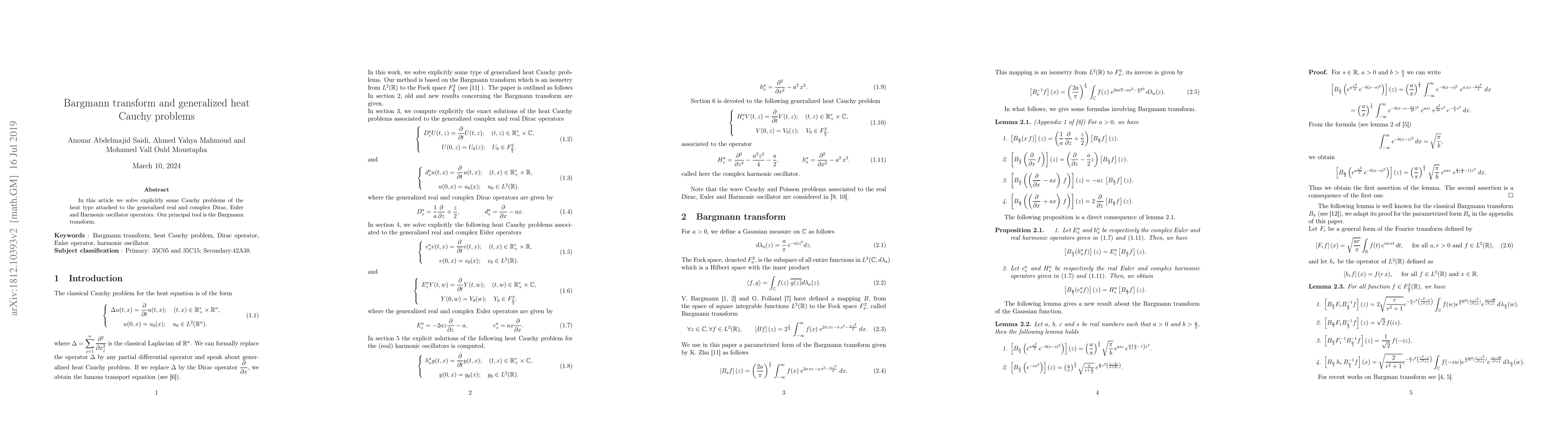 In this article we solve explicitly some Cauchy problems of the heat type attached to the generalized real and complex Dirac, Euler and Harmonic oscillator operators. Our principal tool is the Bargmann transform.