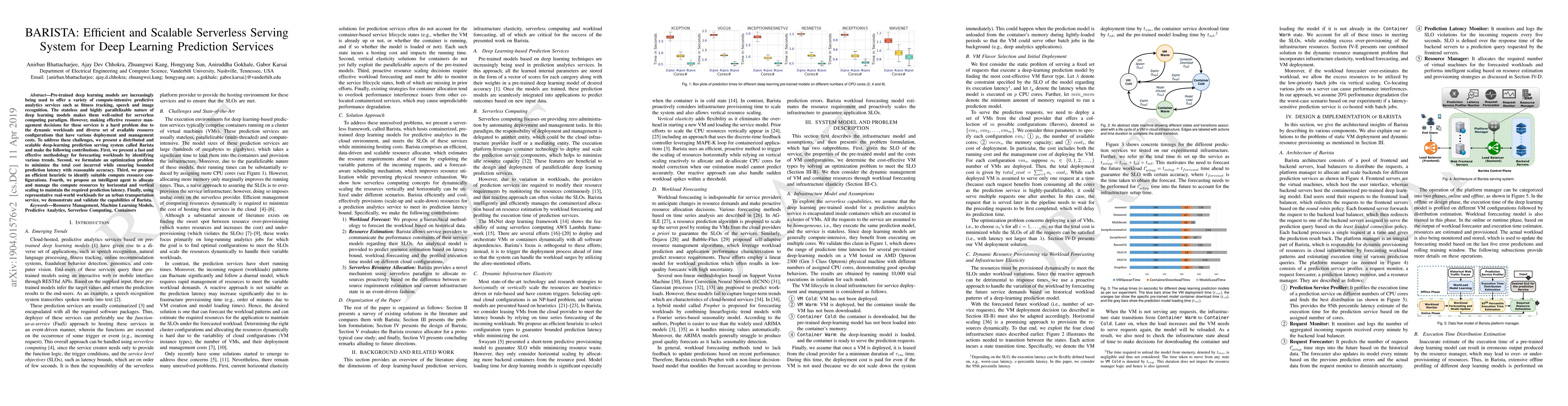 Barista is a distributed and scalable serverless system designed for deep learning prediction services, addressing resource management challenges through workload forecasting, optimization, and intelligent resource allocation. The system effectively scales resources to meet prediction latency requirements while minimizing costs.
