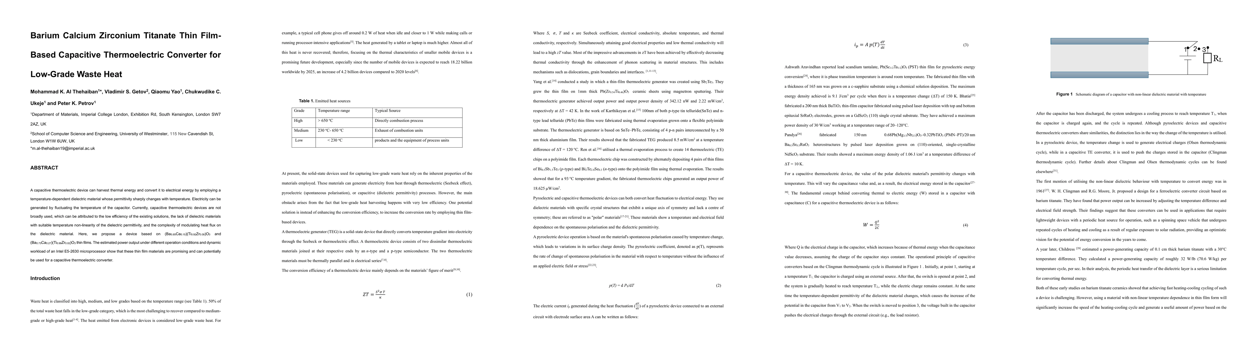 Researchers propose a new capacitive thermoelectric device using barium calcium zirconium titanate thin films to convert low-grade waste heat into electrical energy with promising efficiency. The devices show potential for practical application in harnessing waste heat from electronics.