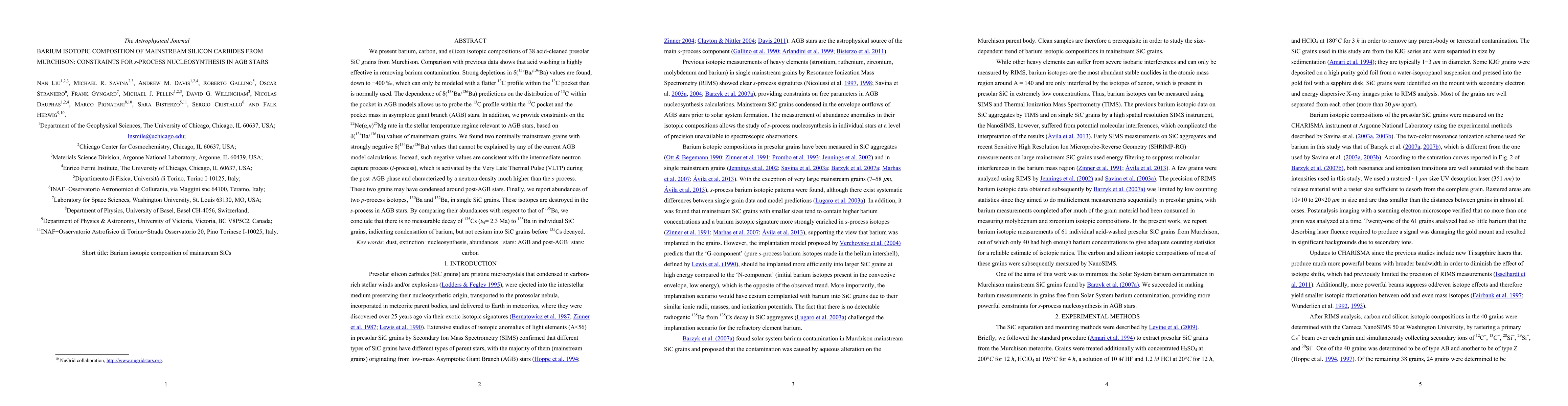 We present barium, carbon, and silicon isotopic compositions of 38 acid-cleaned presolar SiC grains from Murchison. Comparison with previous data shows that acid washing is highly effective in removing barium contamination. Strong depletions in $\delta$($^{138}$Ba/$^{136}$Ba) values are found, down to $-$400 permil, which can only be modeled with a flatter $^{13}$C profile within the $^{13}$C pocket than is normally used. The dependence of $\delta$($^{138}$Ba/$^{136}$Ba) predictions on the distribution of $^{13}$C within the pocket in AGB models allows us to probe the $^{13}$C profile within the $^{13}$C pocket and the pocket mass in asymptotic giant branch (AGB) stars. In addition, we provide constraints on the $^{22}$Ne$(\alpha,n)^{25}$Mg rate in the stellar temperature regime relevant to AGB stars, based on $\delta$($^{134}$Ba/$^{136}$Ba) values of mainstream grains. We found two nominally mainstream grains with strongly negative $\delta$($^{134}$Ba/$^{136}$Ba) values that cannot be explained by any of the current AGB model calculations. Instead, such negative values are consistent with the intermediate neutron capture process ($i$-process), which is activated by the Very Late Thermal Pulse (VLTP) during the post-AGB phase and characterized by a neutron density much higher than the $s$-process. These two grains may have condensed around post-AGB stars. Finally, we report abundances of two $p$-process isotopes, $^{130}$Ba and $^{132}$Ba, in single SiC grains. These isotopes are destroyed in the $s$-process in AGB stars. By comparing their abundances with respect to that of $^{135}$Ba, we conclude that there is no measurable decay of $^{135}$Cs ($t_{1/2}$= 2.3 Ma) to $^{135}$Ba in individual SiC grains, indicating condensation of barium, but not cesium into SiC grains before $^{135}$Cs decayed.