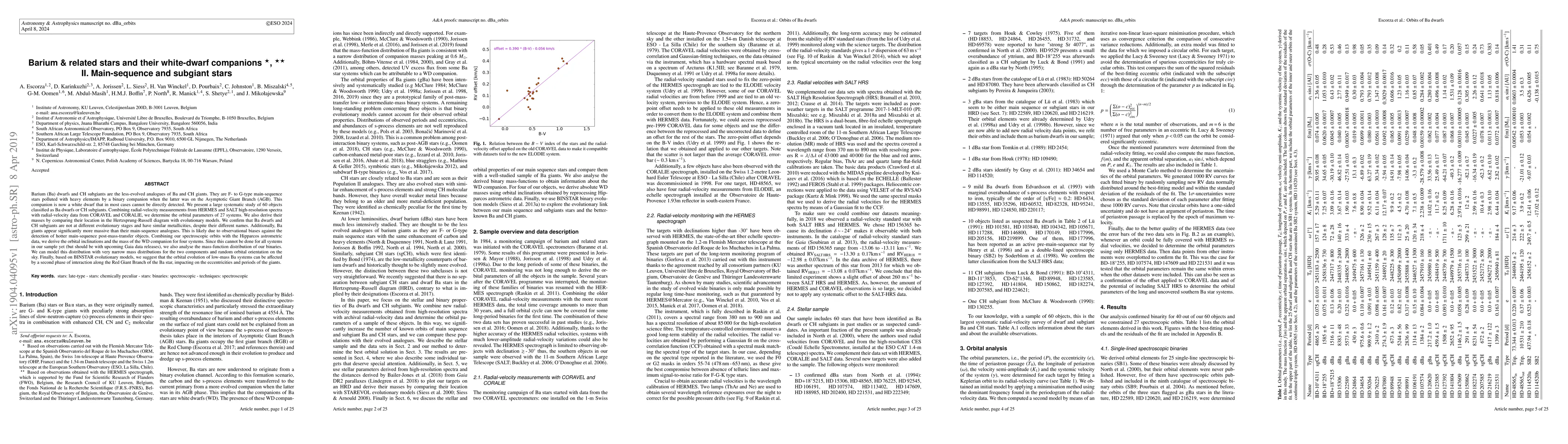 Barium (Ba) dwarfs and CH subgiants are the less-evolved analogues of Ba and CH giants. They are F- to G-type main-sequence stars polluted with heavy elements by a binary companion when the latter was on the Asymptotic Giant Branch (AGB). This companion is now a white dwarf that in most cases cannot be directly detected. We present a large systematic study of 60 objects classified as Ba dwarfs or CH subgiants. Combining radial-velocity measurements from HERMES and SALT high-resolution spectra with radial-velocity data from CORAVEL and CORALIE, we determine the orbital parameters of 27 systems. We also derive their masses by comparing their location in the Hertzsprung-Russell diagram with evolutionary models. We confirm that Ba dwarfs and CH subgiants are not at different evolutionary stages and have similar metallicities, despite their different names. Additionally, Ba giants appear significantly more massive than their main-sequence analogues. This is likely due to observational biases against the detection of hotter main-sequence post-mass-transfer objects. Combining our spectroscopic orbits with the Hipparcos astrometric data, we derive the orbital inclinations and the mass of the WD companion for four systems. Since this cannot be done for all systems in our sample yet (but should be with upcoming Gaia data releases), we also analyse the mass-function distribution of our binaries. We can model this distribution with very narrow mass distributions for the two components and random orbital orientation on the sky. Finally, based on BINSTAR evolutionary models, we suggest that the orbital evolution of low-mass Ba systems can be affected by a second phase of interaction along the Red Giant Branch of the Ba star, impacting on the eccentricities and periods of the giants.