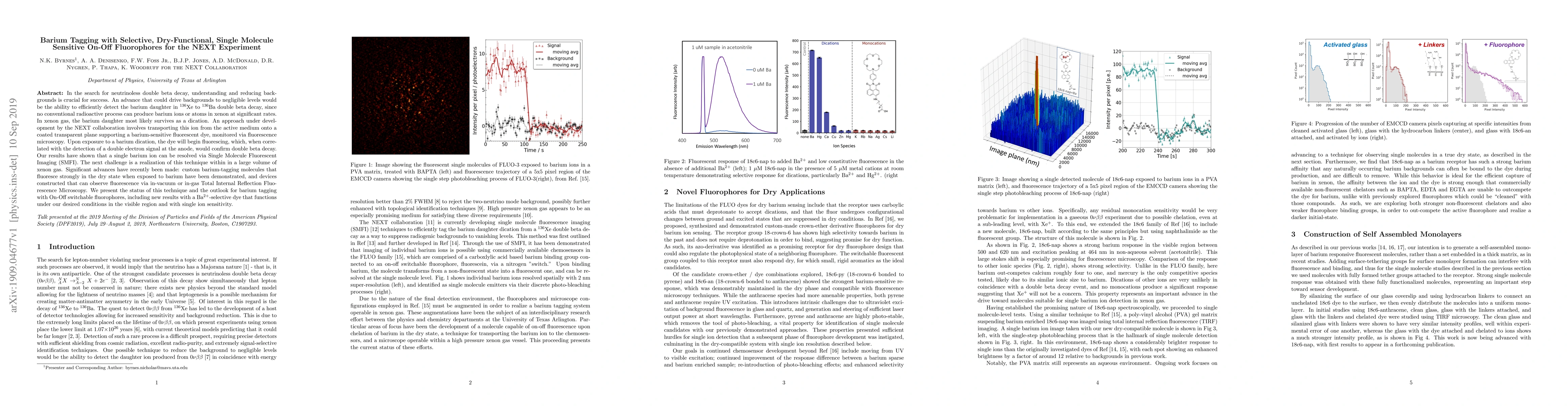 The NEXT experiment aims to detect neutrinoless double beta decay by tagging barium ions produced in xenon gas. A new approach involves using selective, dry-functional, single molecule sensitive fluorophores to detect barium dications via fluorescence microscopy, achieving single ion resolution and promising large-scale application.
