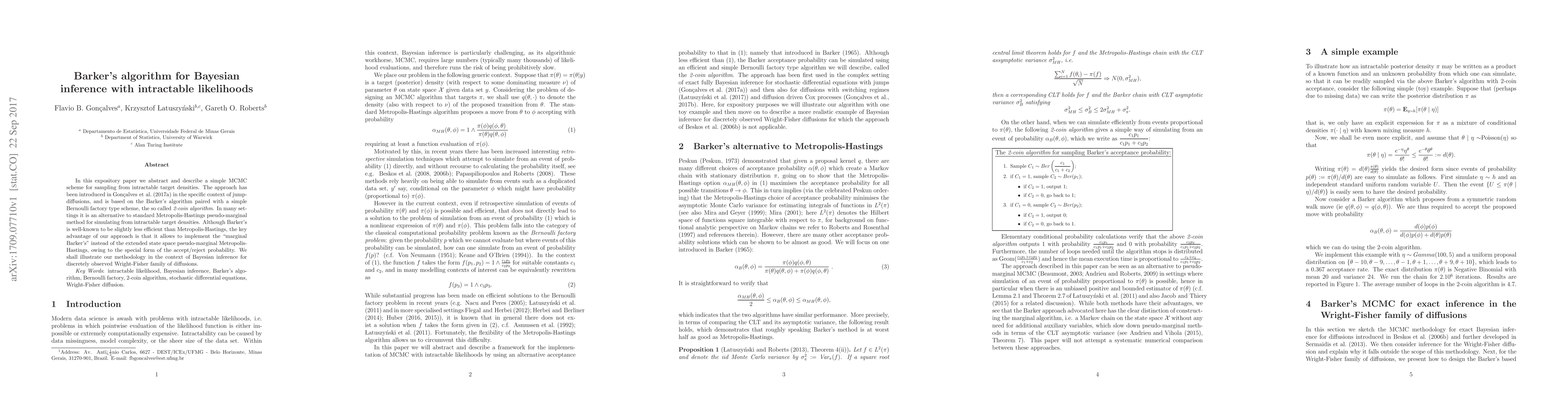This paper introduces Barker's algorithm combined with a Bernoulli factory scheme for sampling from intractable target densities, offering an alternative to the Metropolis-Hastings method. The approach is demonstrated in the context of Bayesian inference for discretely observed Wright-Fisher diffusions.