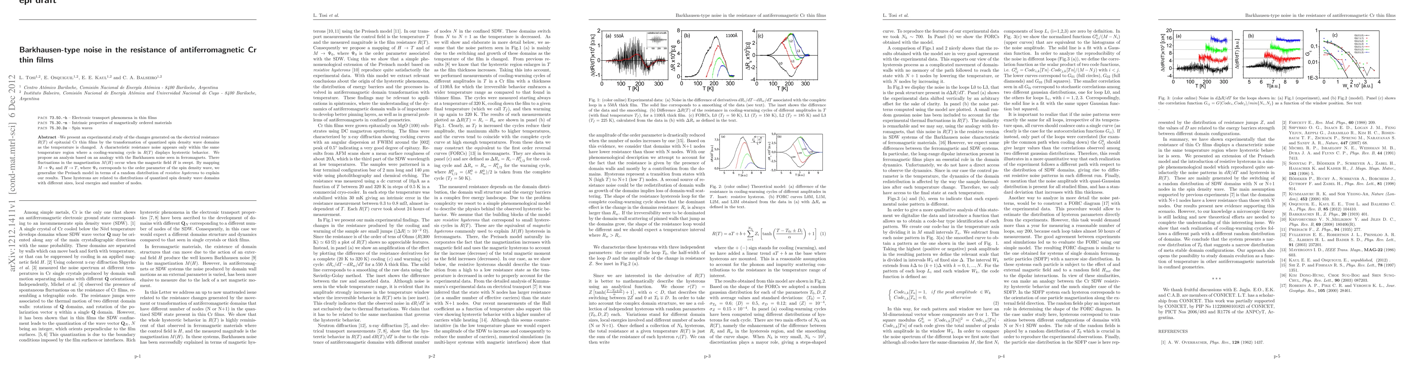 We present an experimental study of the changes generated on the electrical resistance $R(T)$ of epitaxial Cr thin films by the transformation of quantized spin density wave domains as the temperature is changed. A characteristic resistance noise appears only within the same temperature region where a cooling-warming cycle in $R(T)$ displays hysteretic behavior. We propose an analysis based on an analogy with the Barkhausen noise seen in ferromagnets. There fluctuations in the magnetization $M(H)$ occur when the magnetic field $H$ is swept. By mapping $M \rightarrow \Psi_0$ and $H \rightarrow T$, where $\Psi_0$ corresponds to the order parameter of the spin density wave, we generalize the Preisach model in terms of a random distribution of {\it resistive hysterons} to explain our results. These hysterons are related to distributions of quantized spin density wave domains with different sizes, local energies and number of nodes.